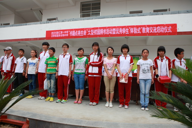 仪式结束后,我校33名同学分别走进漩涡中学24个班级宣读曲江一中同学来信,并向结对班级赠送了图书。