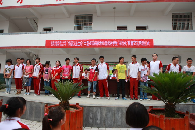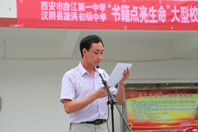 14时40,曲江一中、漩涡中学“书籍点亮生命”大型校园捐书活动暨“体验式”教育交流启动仪式在漩涡中学小广场隆重举行。汉阴县体卫局考试中心主任储茂斌、漩涡中学校长钟正、副校长鲁维明、副校长付刚、学校办公室主任饶自奎、政教处主任黄磊、我校常务副校长陈勇刚、学校办公室副主任申小娟等37名师生及漩涡中学全体师生参加了这次仪式。仪式由漩涡中学副校长鲁维明主持。