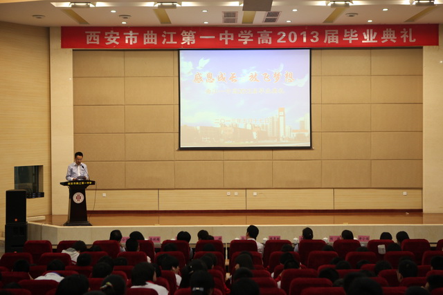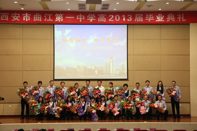 清风送爽,细雨霏霏。5月17日,西安市曲江第一中学高2013届毕业典礼在学校报告厅隆重举行。曲江新区管委会教育卫生局局长郭军、曲江一中常务副校长陈勇刚、副校长曹琦、学校办公室兼政教处主任余爱东、教务处兼招生办主任朱琳瑛、学校办公室副主任申小娟、教务处副主任兼高三年级组长高秋棉、政教处副主任兼九年级组长刘瑜、教研室副主任兼高一年级组长刘公潜及高2013届全体师生一起度过这个令人难忘而感动的时刻。