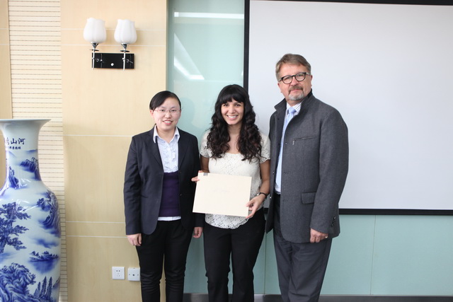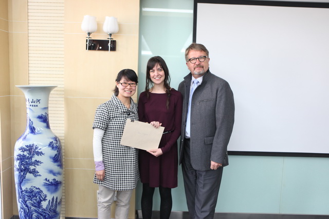 西蒙弗雷泽大学带队老师Robert和实习教师为曲江一中张洁老师颁发指导教师证书
