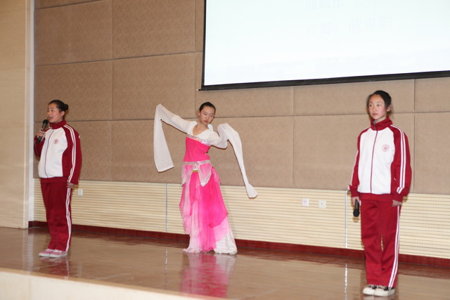 比赛在五班同学铿锵有力的《过零丁洋》朗诵中拉开帷幕,各班同学欲与天公试比高,诵读声一波胜比一波,犹如江海之势,或滚滚滔滔,或低迷凄婉,余音袅袅。心心相印环节中,孩子们尽显智者之灵气与才干,惹得全场唏嘘不已,掌声不断。比赛很快就到孩子们最喜欢的个性诵读阶段了,脱下校服的孩子们,穿着精心准备的裙裾长褂,伴着悠悠古筝之声,旋动他们曼妙的舞姿。五班同学一首悲壮狂放的《将进酒》道尽满腔愁苦;三班同学一曲凄迷伤怀的《凤凰惊鸿》诵尽淡淡哀伤,一班同学一篇逼真传神的《渔父》让人刮目相看。欢呼声中,迎来了最具挑战的即兴演讲环节,七班韩笑丛的落落大方赢得全场屏气凝神,九班庞雨佳的聪明机智博得喝彩连连。