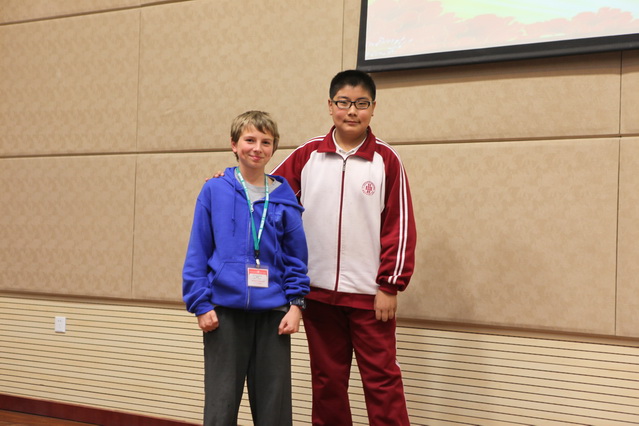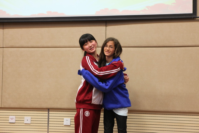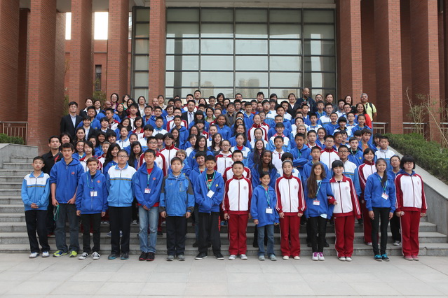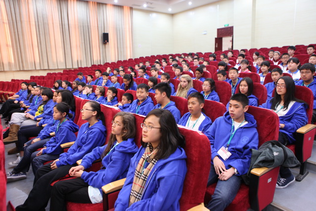 曲江一中学生薛皓韦与李泳仪代表中方学生发言。两位同学在发言中介绍了师大附中与曲江一中的办学特色与校园课程,希望能在接下来的三天里带着美国朋友们品尝西安美食,了解本地风光。随后,尤方玉屏学校司徒校长与我校副校长曹琦代表两校互相交换了礼物。最后,在热烈融洽的气氛中,中美双方结对学生见面,并用英语进行了交流,合影留念。