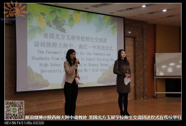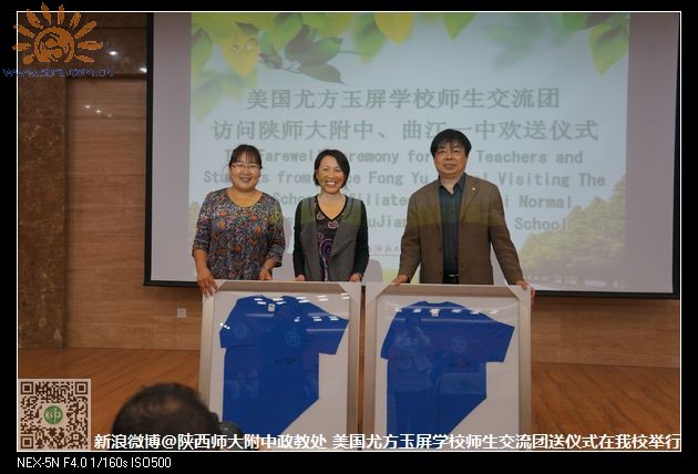 欢送仪式上,陕师大附中政教副主任高姗首先致欢送辞,在表达了对远道而来的朋友诚挚欢迎之意的同时,她表示中美双方学生在此活动中通过多种方式更深入地了解了两国文化,结下了深厚情谊,搭起了友谊之桥,这次活动给两国学生提供了很好的学习和交流平台,希望以后能加强两国学生师生之间的交流。接着,尤方玉屏学校的杨诗敏同学上台讲了自己在西安这四天的所见所闻以及对西安这座古都的感受。随后,尤方玉屏学校的司徒校长上台发表了感言。在此之后,陕师大附中、曲江一中给美国同学颁发了“home stay”证书,双方学校与尤方玉屏学校还互赠了礼物,表达了双方学校的友谊。最后,曲江一中的政教主任余爱东老师,以诗代柳,送别了美国学生,两校在场学生全体起立,集体诵读了《送杜少府之任蜀州》。仪式结束后,双方学生在报告厅前合影留念,把师生之间的情谊永驻在照片中。