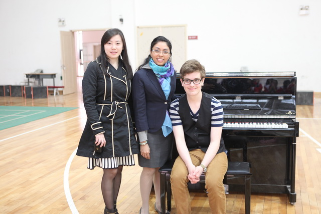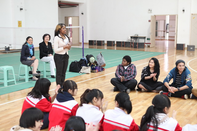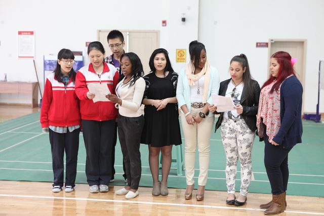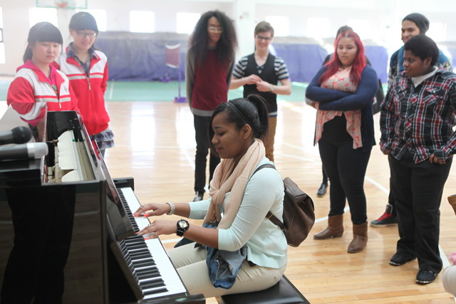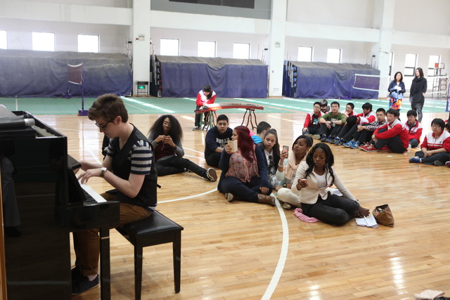 体育馆里,中美两国师生在黄晨老师的组织下,共同唱响《同桌的你》《佳人曲》等中国歌曲,美国学生也为我们学生带来了他们最拿手的街舞和钢琴表演。两国师生欢聚一堂,演奏着最动听的交流之音。
