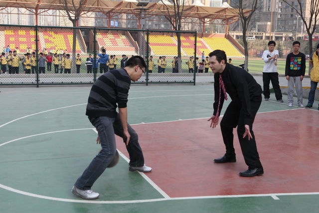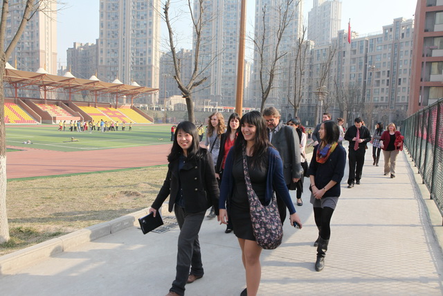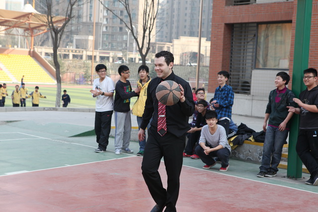 会前,学校办公室外事干事孙晓珍带领客人参观了校园,对我校的基本情况和硬件建设做了详细的说明。在参观的过程中,高2014届4班正在上体育篮球课,实习教师饶有兴致地走进篮球场,和同学们一起切磋篮球,博得了在场师生的阵阵掌声。