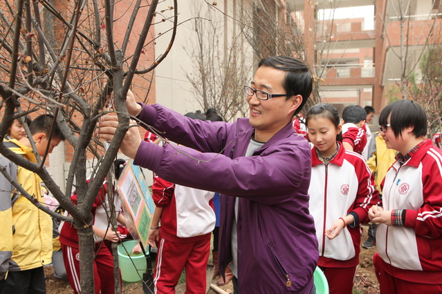 植树现场在工人师傅的协助下,大家很快熟悉了栽苗、浇水的技术要领。随后,大家手持铁锹,干劲十足,将一棵棵充满生机和希望的树苗植入土壤,半个多小时后,15棵红梅树苗种植完毕。最后,同学们将印有自己名字或班级格言的牌子挂在了小树苗上,集体合影留念,意犹未尽地离开了自己的劳动现场。