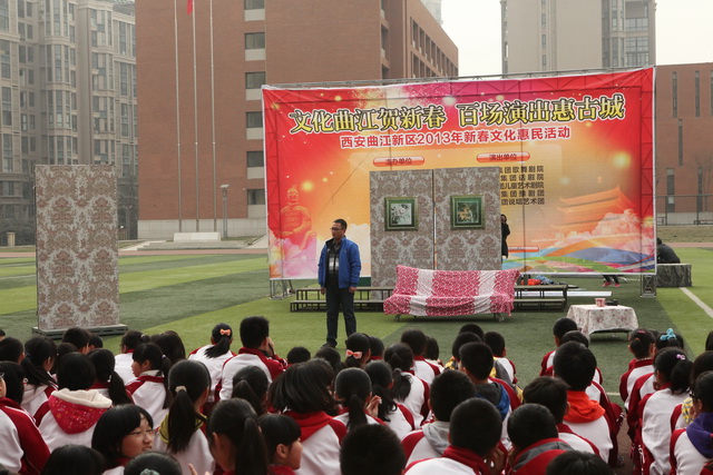 2013年3月13日,由曲江儿童大剧院主办的“文化曲江贺新春,百场演出惠古城”——西安曲江新区2013年新春文化惠民活动走进了曲江一中的校园,为学校师生呈现了一出精彩的视觉盛宴,七年级、八年级的所有学生以及班主任观看了此次演出。