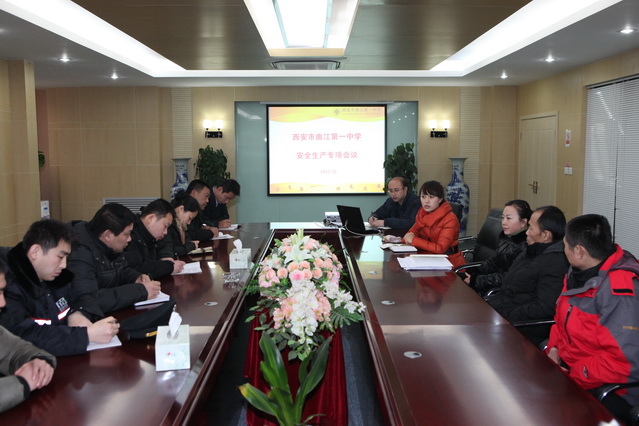 2012年12月31日下午,西安市曲江第一中学在行政楼二层会议室召开安全生产工作会议。曲江一中副校长曹琦、总务处主任王锦、圣境物业副总经理李娜、总务干事刘佳及曲江一中项目部相关工作人员参加会议。会议由曹校长主持。