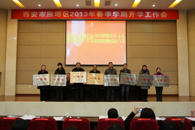 大会首先由区教育局副局长徐三雄作雁塔区2012年教育工作总结,并安排部署了2013年相关工作;随后,区教育局党委书记张水利通报表彰了2012年省级素质教育优秀学校、省级教育督导先进区县、个人,并通报了西安市实施市级素质教育优秀学校、市大学区管理制改革先进区县、学区长、成员学校、表彰了雁塔区2012年中小学目标管理考核先进单位等多项表彰决定。我校校长边团结分别代表师大附中、曲江一中上台领取了2012年中小学目标管理考核一等奖、二等奖;区教育局党委书记张水利还宣读了区教育系统作风纪律教育整顿活动的实施方案。