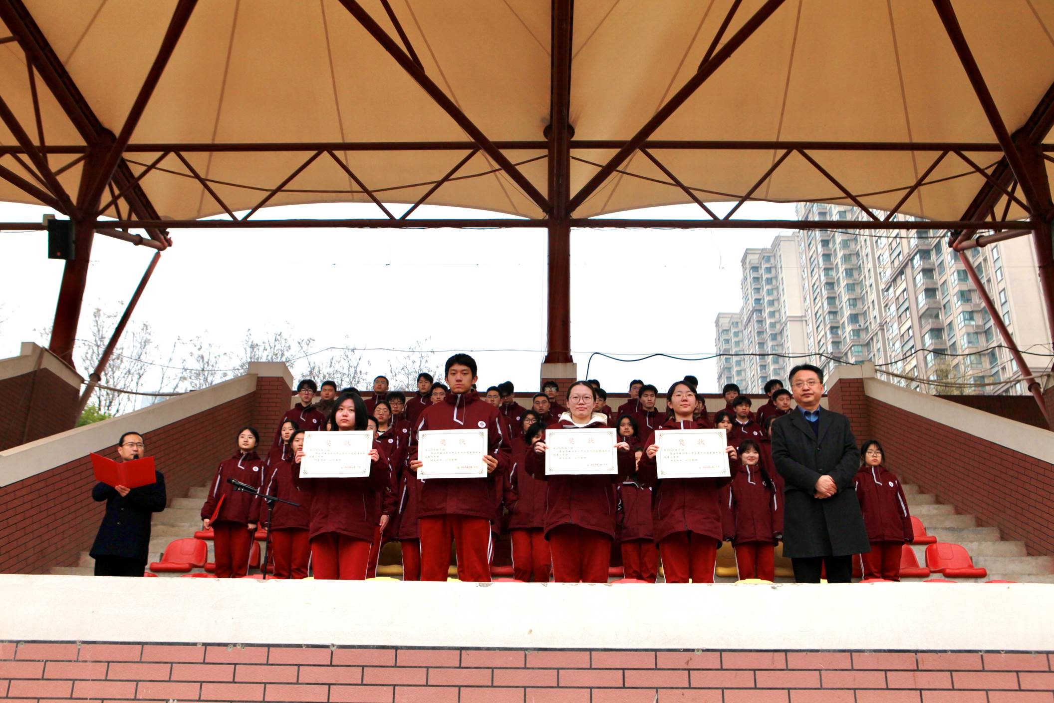 第三项,高2025级2班杨骐聪同学做一分钟英语演讲;第四项,宣读第17周获得“日常行为规范优秀班级”结果;第五项,宣读获奖消息,由校长陈勇刚为获奖学生颁发荣誉证书并合影留念。最后由高2024级7班郭庆阳、杨睿依同学领诵经典诵读文本《锦瑟》和曲江一中校训,嘹亮的诵读声响彻操场,豪迈的气势振奋人心。