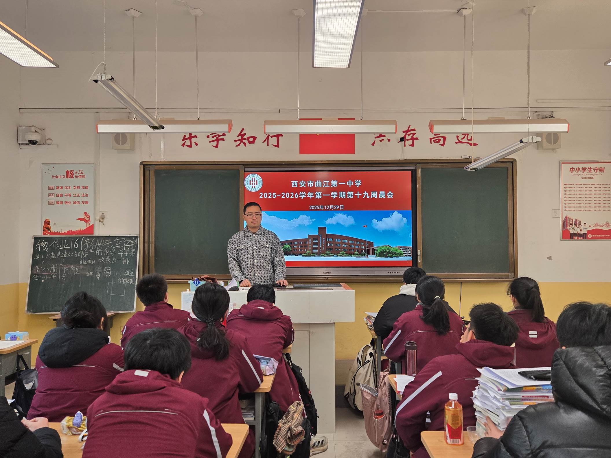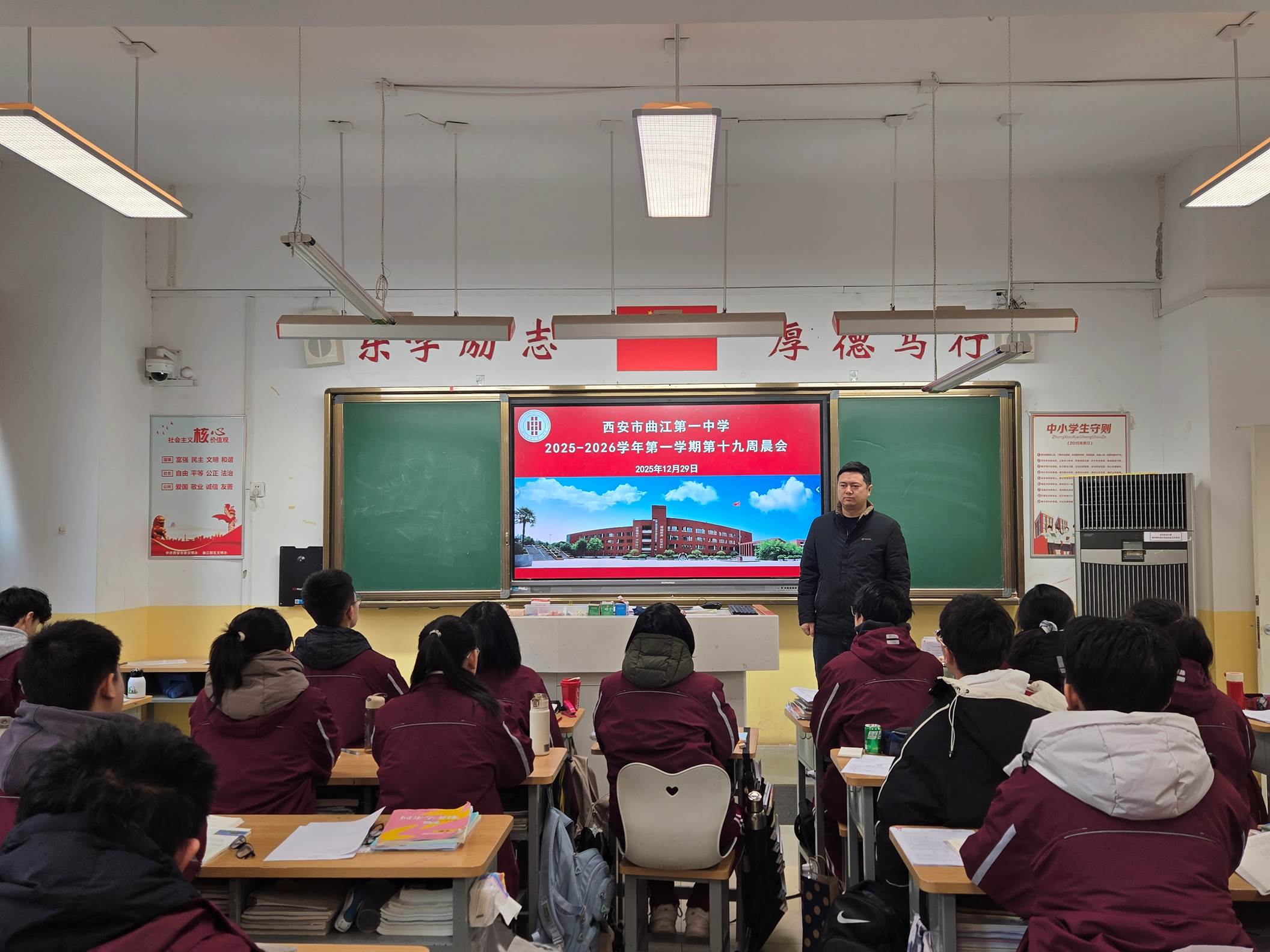 2025年12月29日上午,西安市曲江第一中学组织全体学生在各班教室开展周一晨会,晨会由政教处副主任丁慧芸主持。