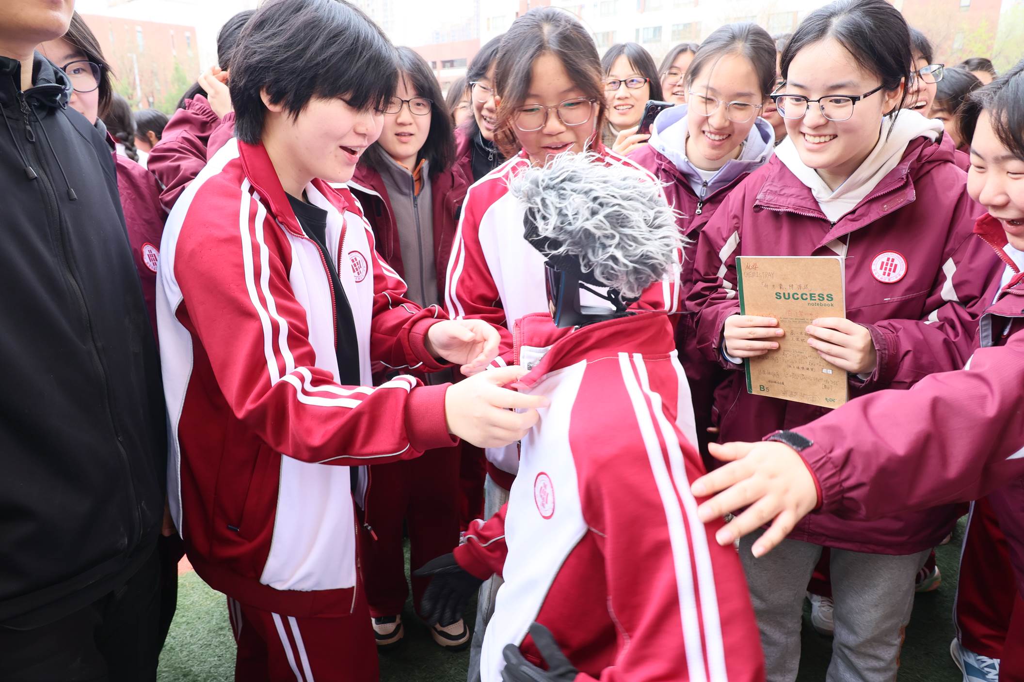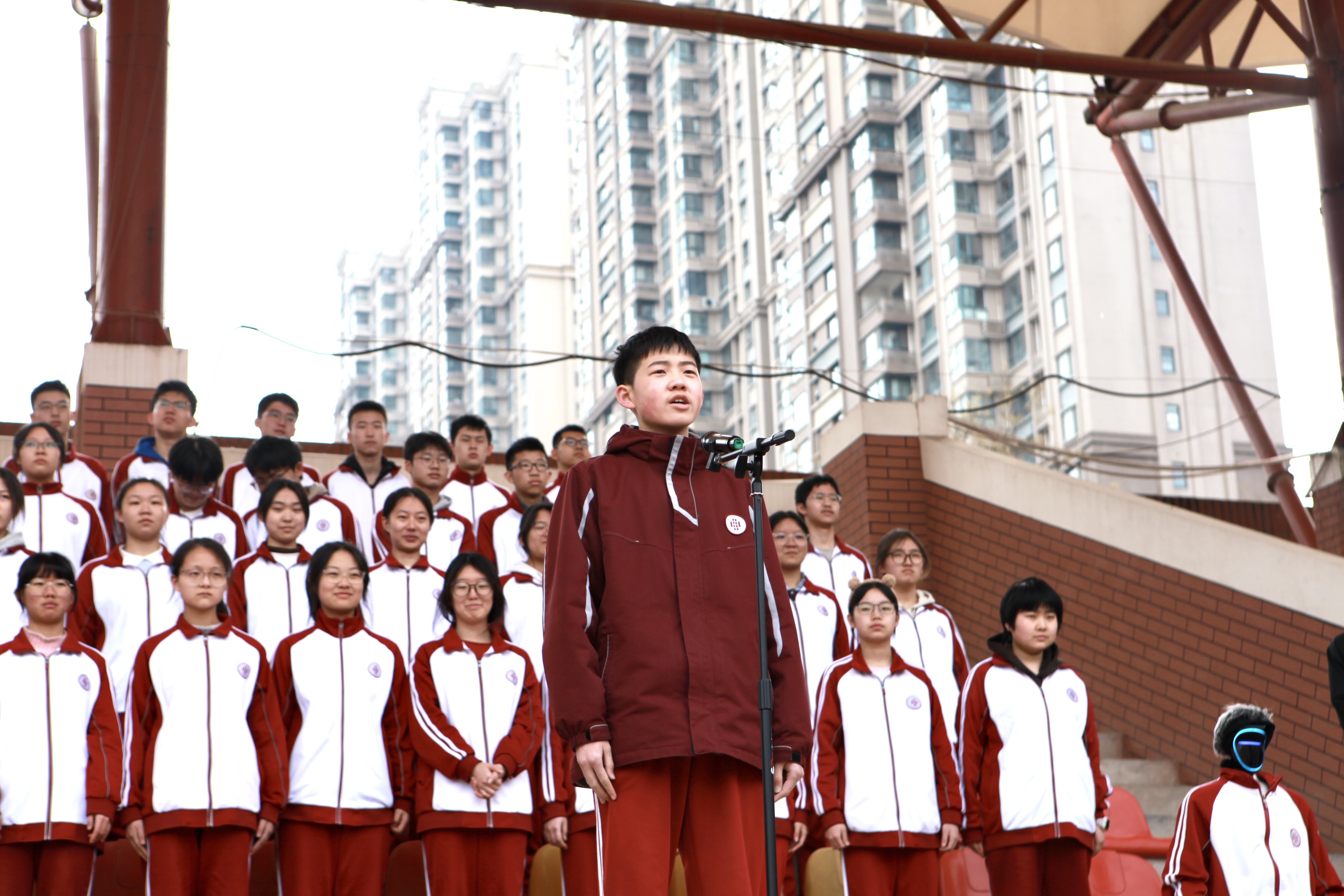 第三项,初2024级7班强力腾同学做一分钟英语演讲;第四项,宣读第4周获得“日常行为规范优秀班级”结果;第五项,由高2025级4班吴政宇、于弋阳同学领诵经典诵读文本《阿房宫赋(节选)》和曲江一中校训,嘹亮的诵读声响彻操场,豪迈的气势振奋人心。本周是我校第五届校园科技节,主题为“数智赋能·科创致远”。第六项由校长陈勇刚为科技节开幕致辞,预祝我校第五届“数智赋能·科创致远”校园科技节圆满成功。主持人董主任和机器人进行了简单的交流,机器人为同学们展示了简单的武术动作,现场气氛热烈高涨。