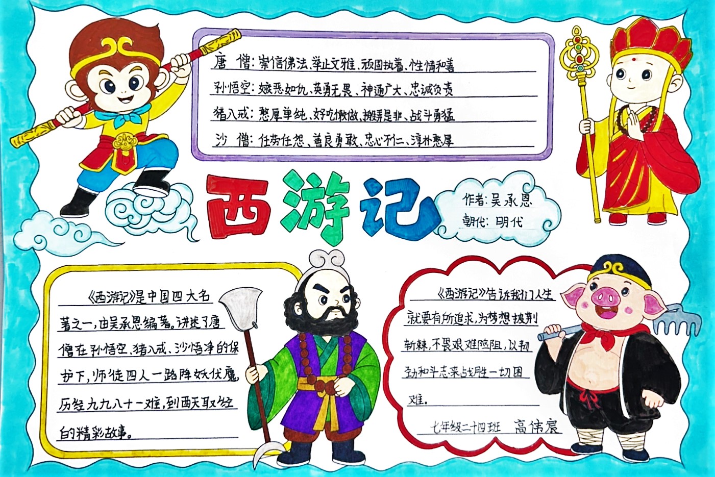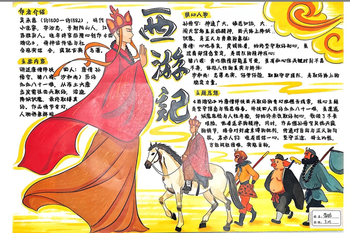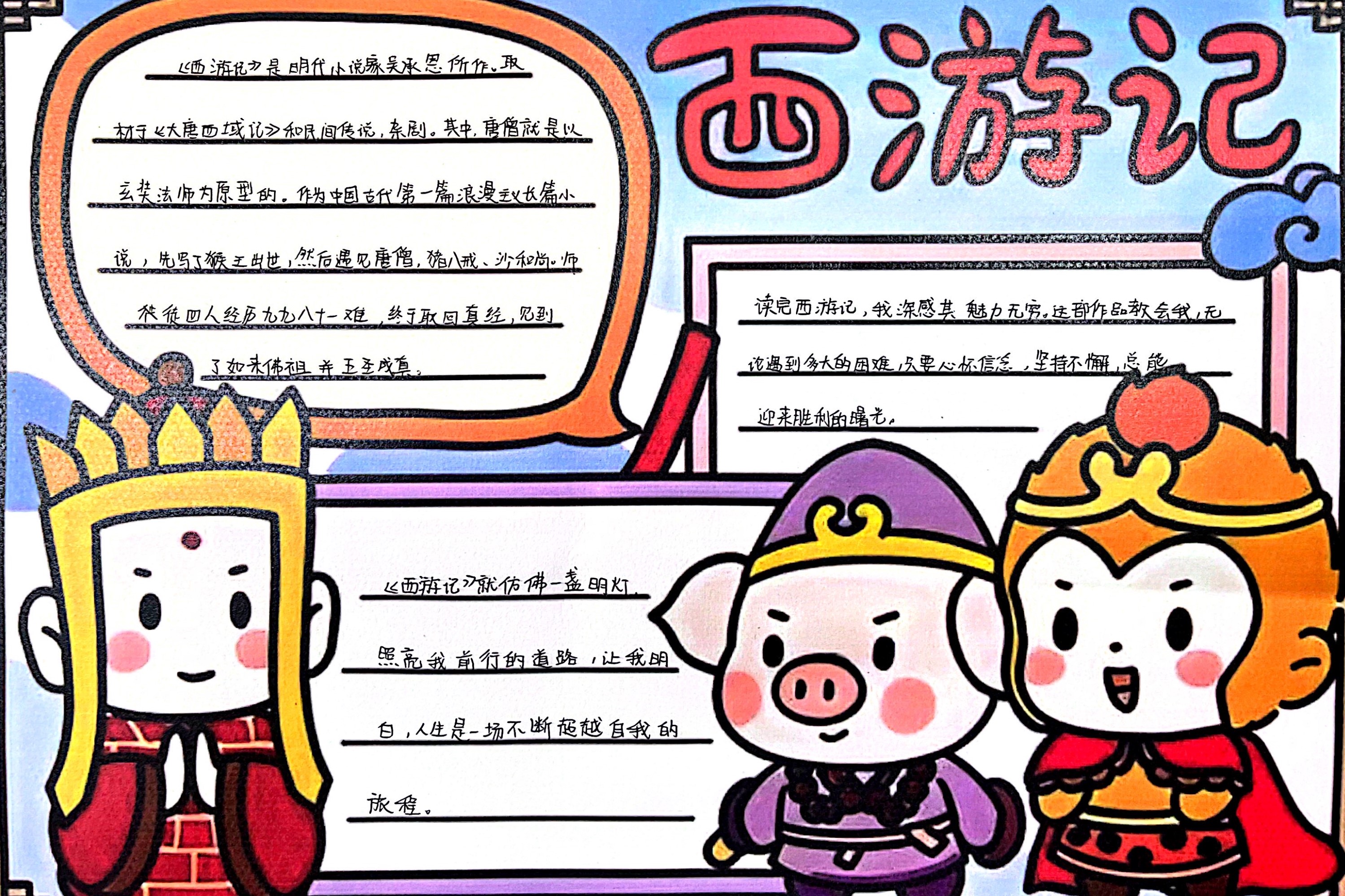 一张张手抄报构思精巧,创意盎然。有的聚焦“三打白骨精”“大闹天宫”“智取红孩儿”等经典情节,人物形象鲜明,场景刻画细腻,仿佛将读者带入那个奇幻诡谲的神魔世界;有的围绕师徒四人的性格特质展开解读——从唐僧的坚定执着、孙悟空的智勇双全,到猪八戒的憨态可掬、沙和尚的忠厚沉稳,字里行间流淌着同学们对角色的个性化理解;还有的另辟蹊径,以“取经精神”为核心,将不畏艰险、团结协作的品质与当下的学习成长相联系,赋予经典全新的时代意义。