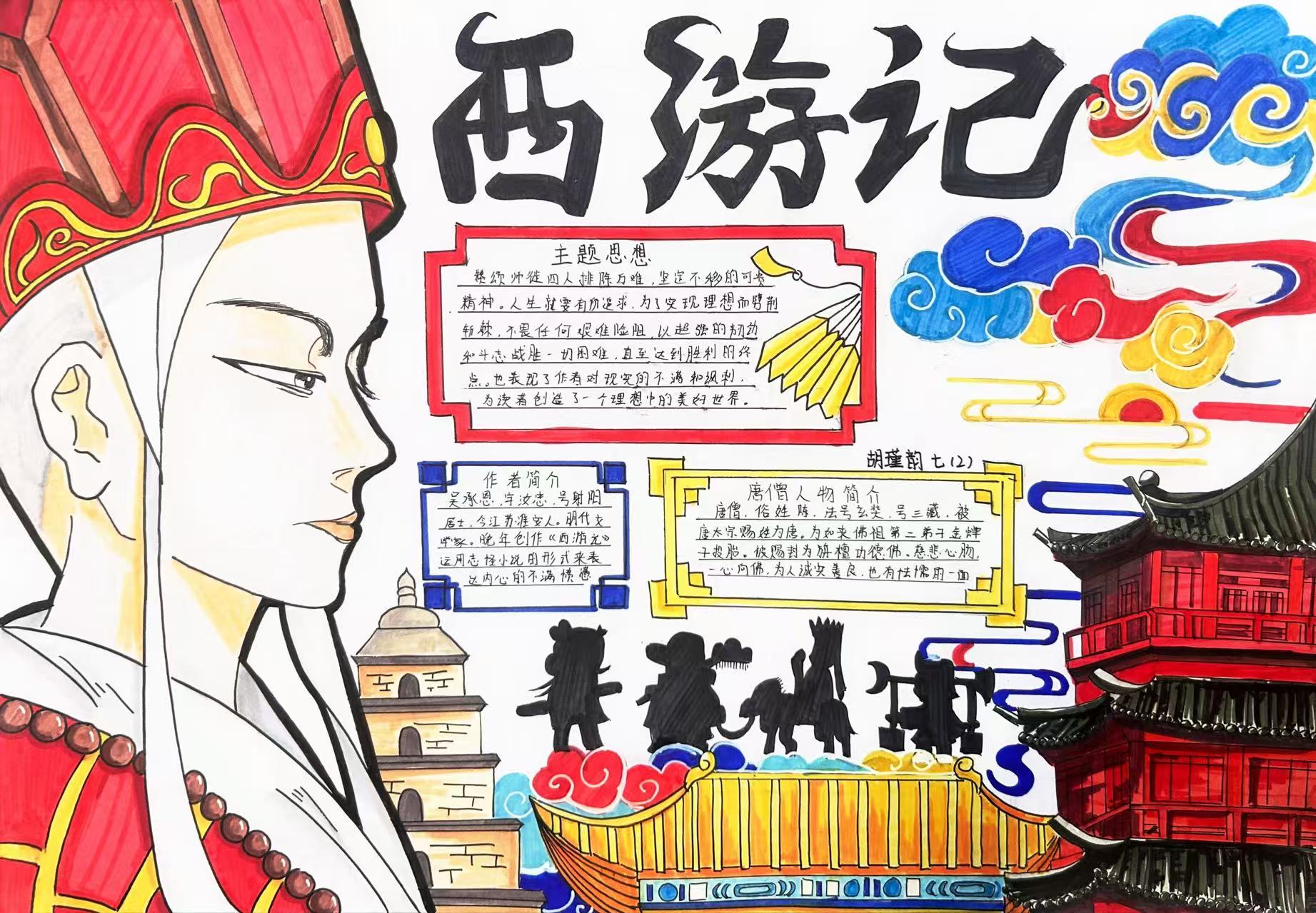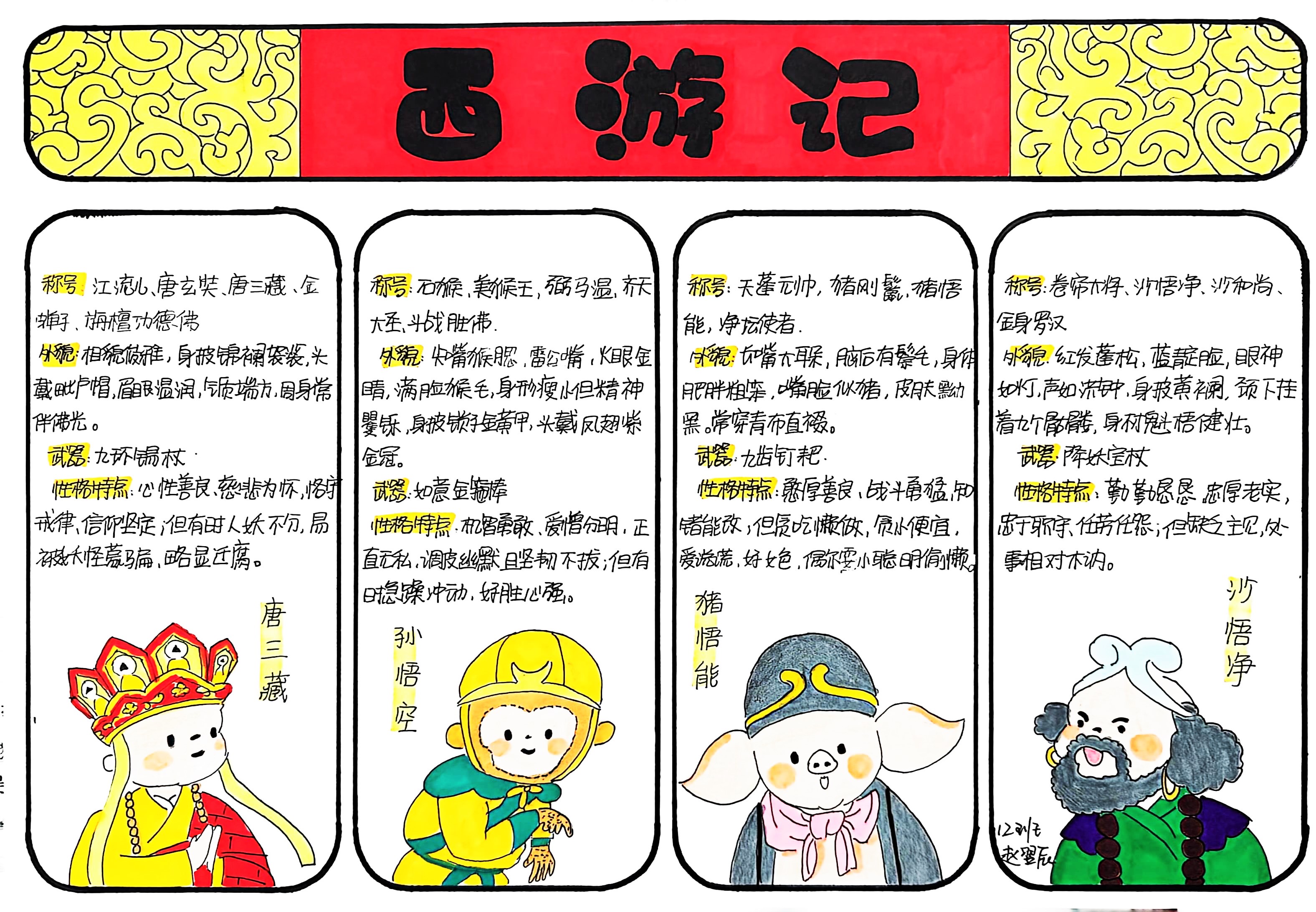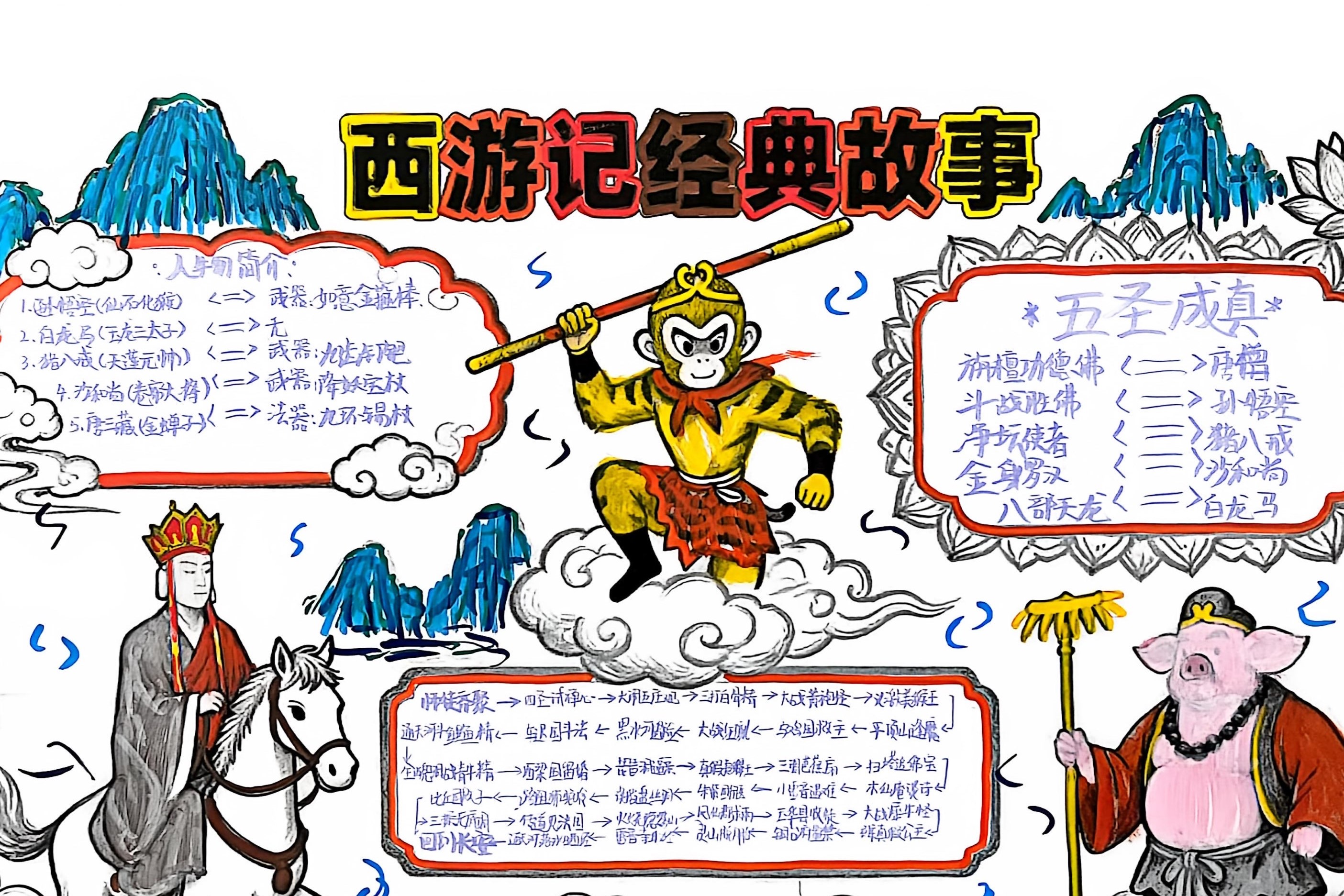 一张张手抄报构思精巧,创意盎然。有的聚焦“三打白骨精”“大闹天宫”“智取红孩儿”等经典情节,人物形象鲜明,场景刻画细腻,仿佛将读者带入那个奇幻诡谲的神魔世界;有的围绕师徒四人的性格特质展开解读——从唐僧的坚定执着、孙悟空的智勇双全,到猪八戒的憨态可掬、沙和尚的忠厚沉稳,字里行间流淌着同学们对角色的个性化理解;还有的另辟蹊径,以“取经精神”为核心,将不畏艰险、团结协作的品质与当下的学习成长相联系,赋予经典全新的时代意义。