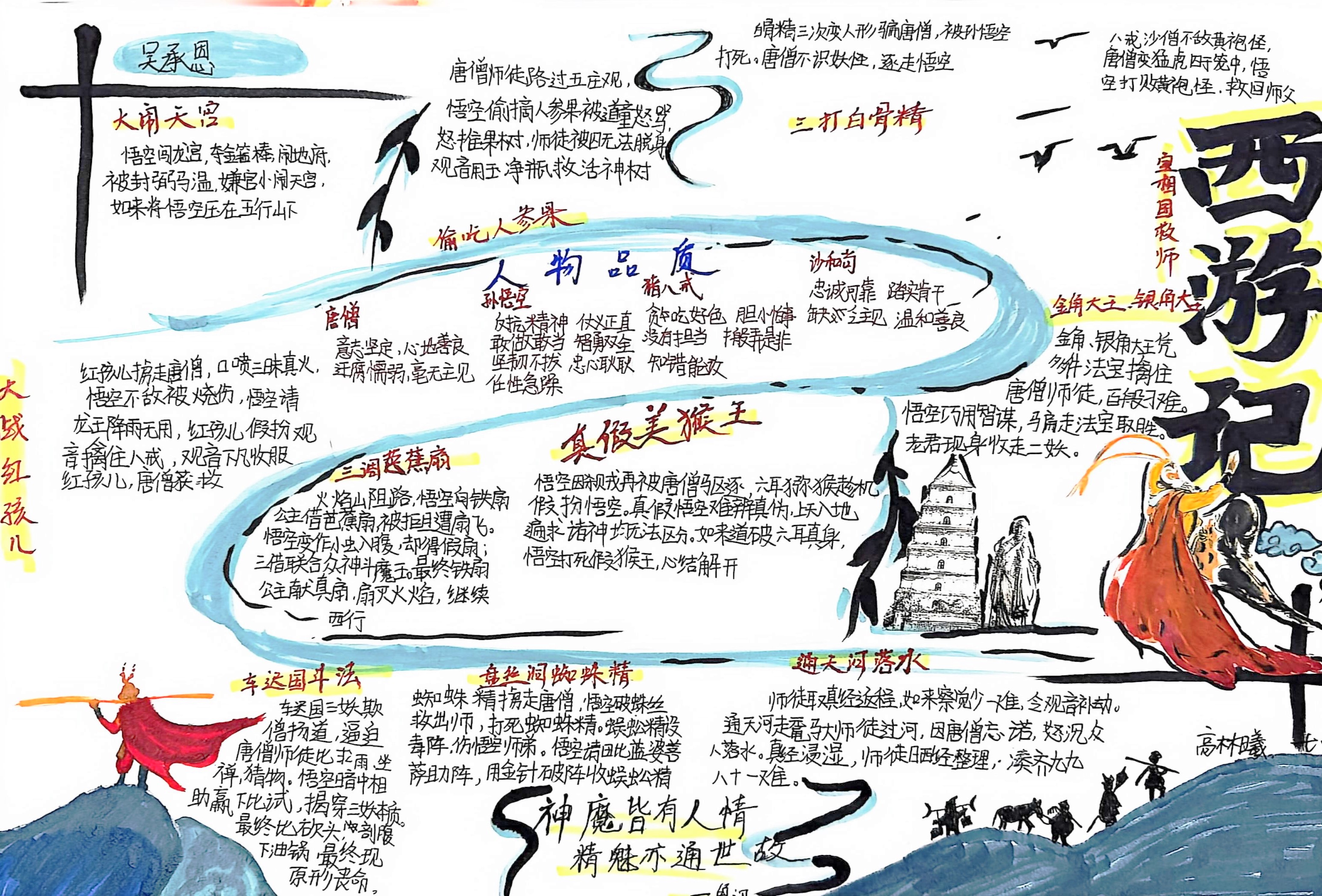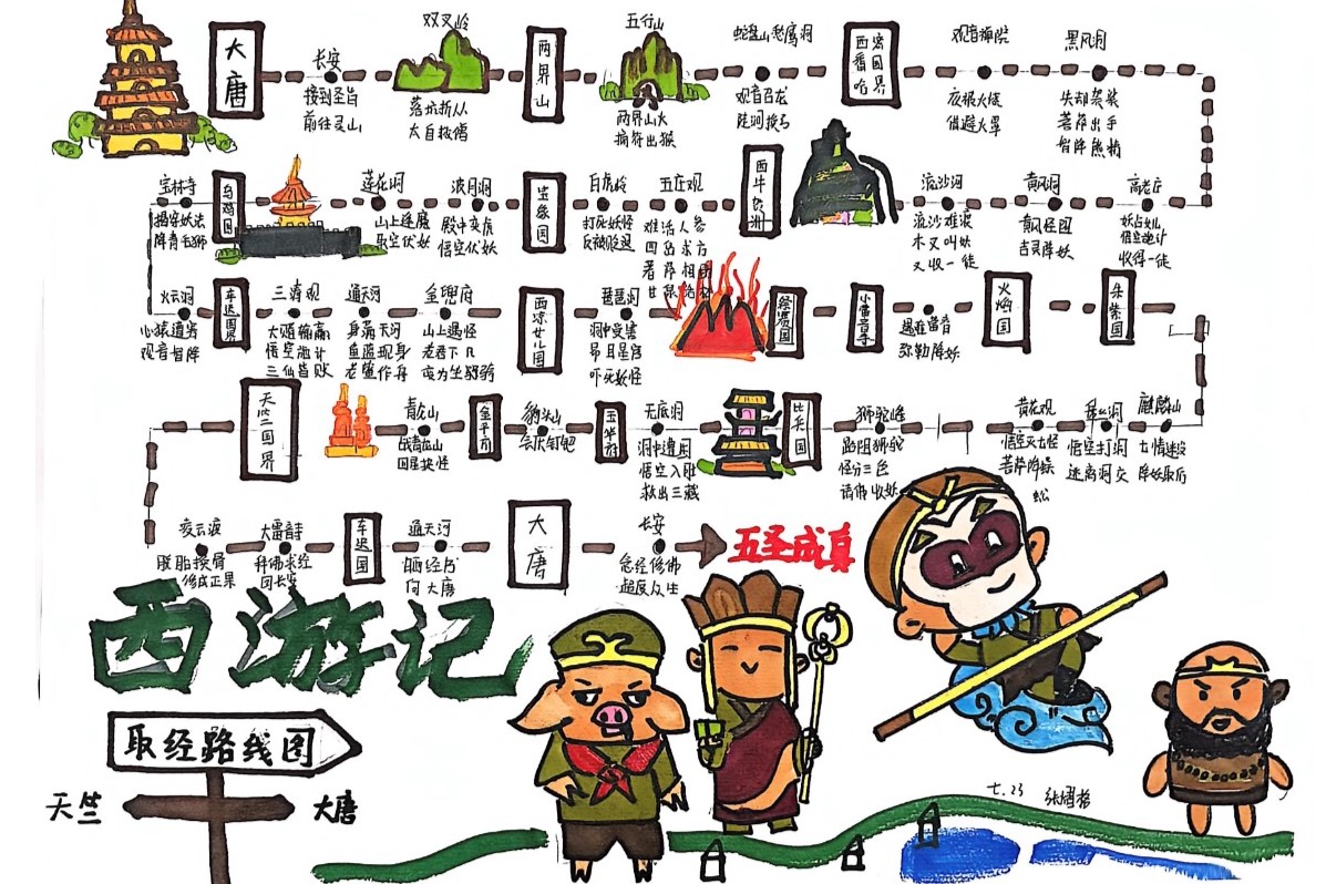 一笔丹青绘神魔,一纸素笺话西游。为丰富校园文化生活,引导学生走进古典名著的瑰丽世界,感受中华优秀传统文化的独特魅力,曲江一中初2025级开展了“手绘取经路,心悟西游情”主题手抄报展示活动。同学们以笔为媒,以纸为桥,将《西游记》中的经典故事与深刻哲思化作一幅幅妙趣横生的画卷,让名著的墨香流淌校园,为校园增添了浓郁的书香气息。