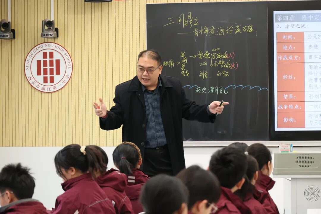 12月15日上午,西安市曲江第一中学举行思维型教学优质课展示暨第十七届赛教活动(历史学科)。本次活动邀请陕西师范大学历史文化学院副院长、副教授郭响宏担任点评专家,曲江一中校长陈勇刚、政教处副主任丁慧芸、历史教研组组长孙静宜、历史教师姜曼担任评委。来自西安市曲江第一中学、西安万科城初级中学的3位教师为我们带来了精彩纷呈的优质课展示。