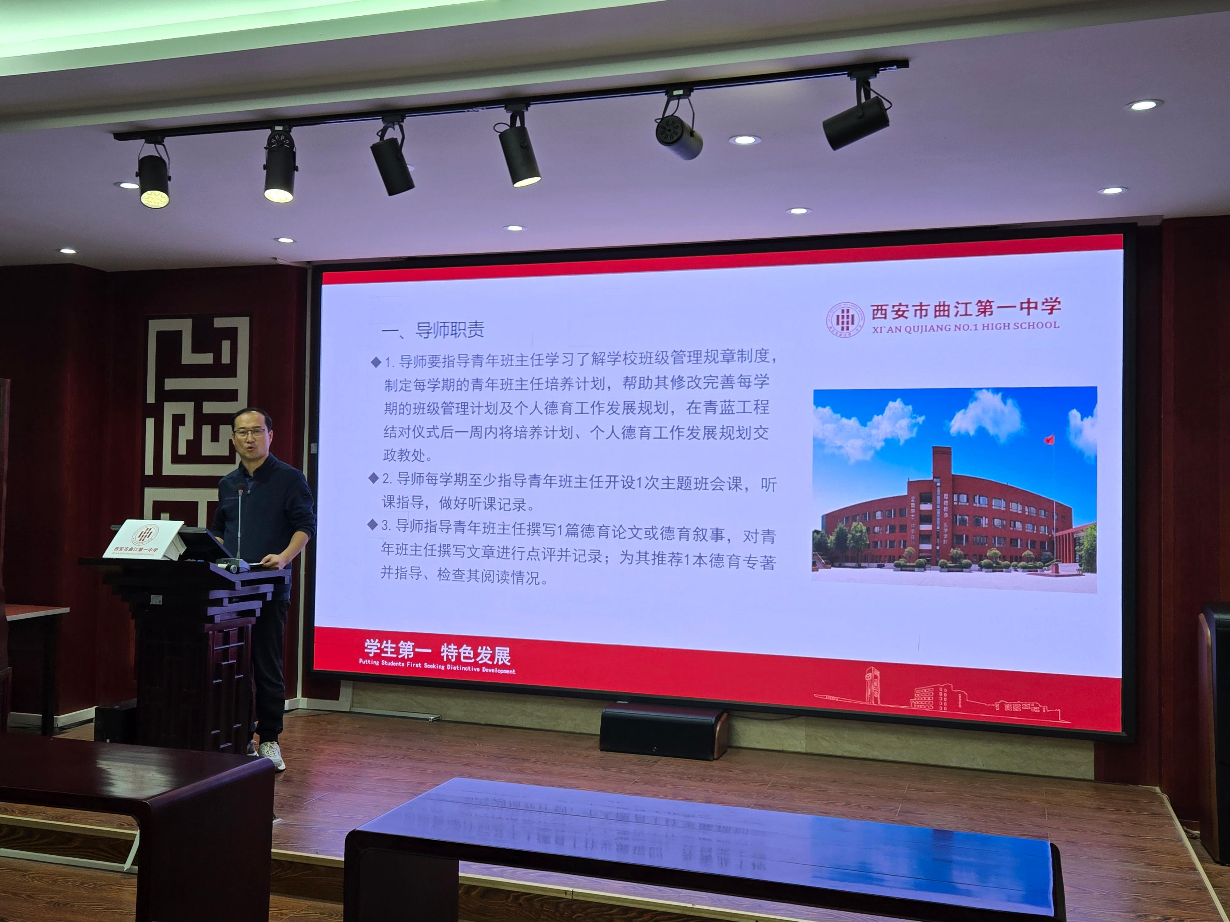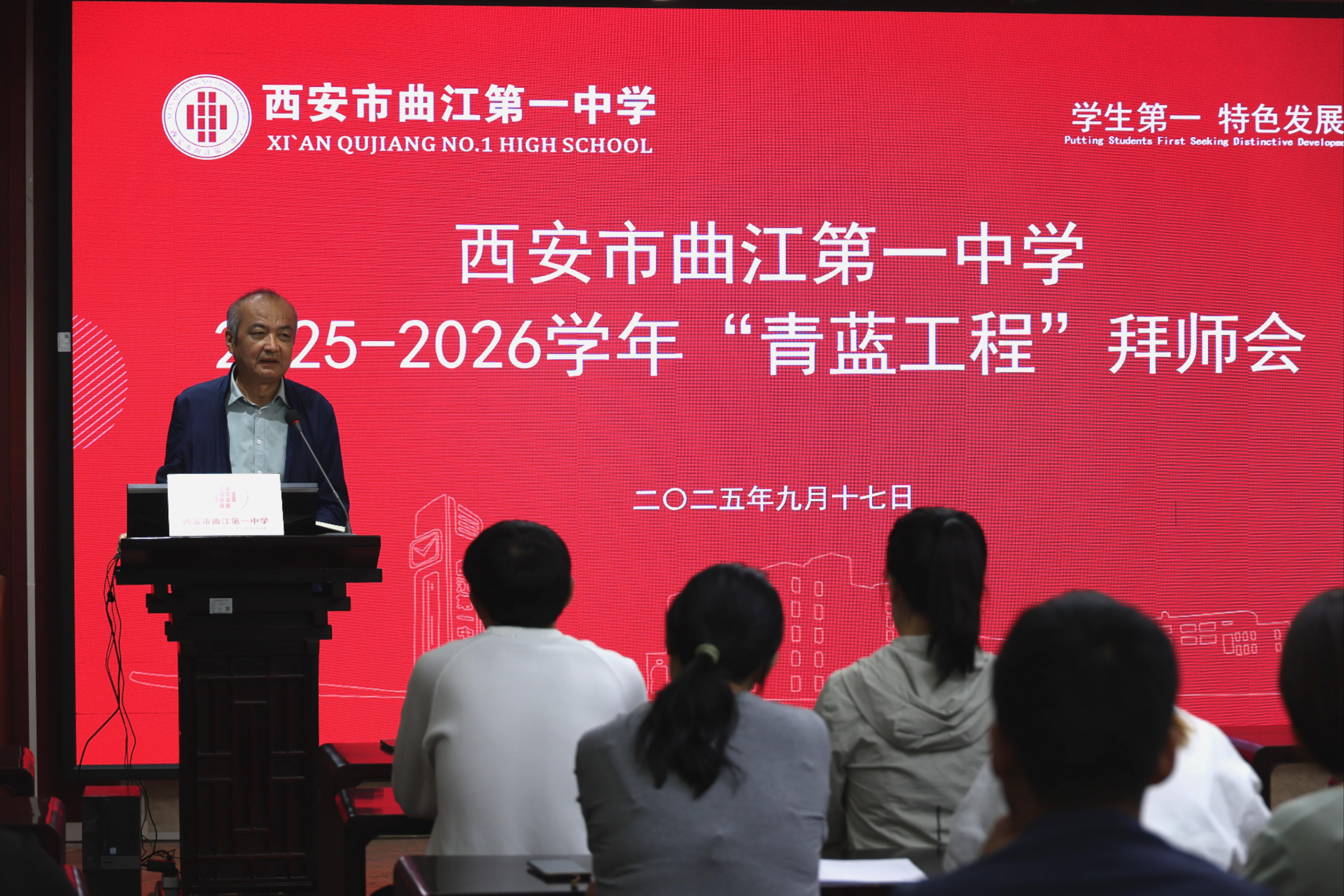 为进一步深化青年教师素质能力提升、加强班主任队伍建设,充分发挥资深、骨干教师的示范引领和“传帮带”作用,2025年9月17日,西安市曲江第一中学在国学教室举行2025-2026学年“青蓝工程”启动仪式。曲江一中副校长刘公潜、政教处副主任董锋、教研室副主任白国强出席活动。