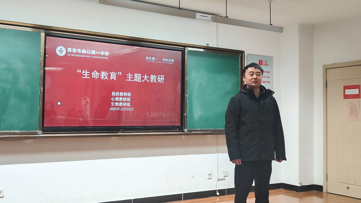 为深化课程育人功能,探索生命教育的多元路径与内在融合,2025年12月22日上午,西安市曲江第一中学思政教研组、心理教研组和生物教研组教师在行政楼四层心理活动室齐聚一堂,共同开展“生命教育”大教研活动。本次活动旨在通过学科交叉视角,共同探讨如何更全面、科学、温暖地引导学生认识生命、珍爱生命、尊重生命、敬畏生命。活动由我校教研室副主任白国强主持。