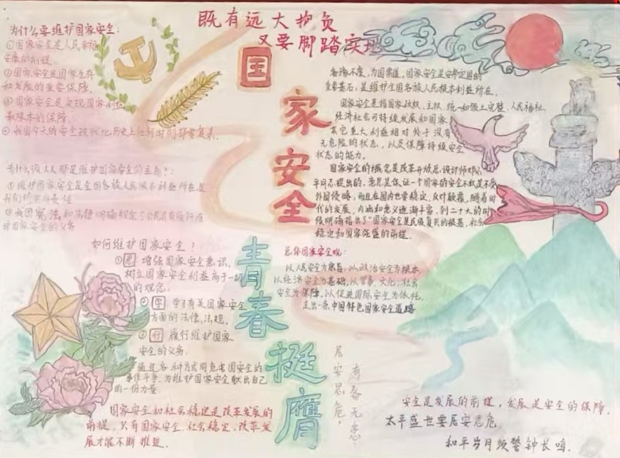 为了让学生们将所学的国家安全知识内化于心、外化于行,同学们充分发挥自己的想象力和创造力,用手中的画笔描绘出对国家安全的认识,这些手抄报不仅展示了学生们扎实的绘画功底,更体现了他们对国家安全的深刻思考。