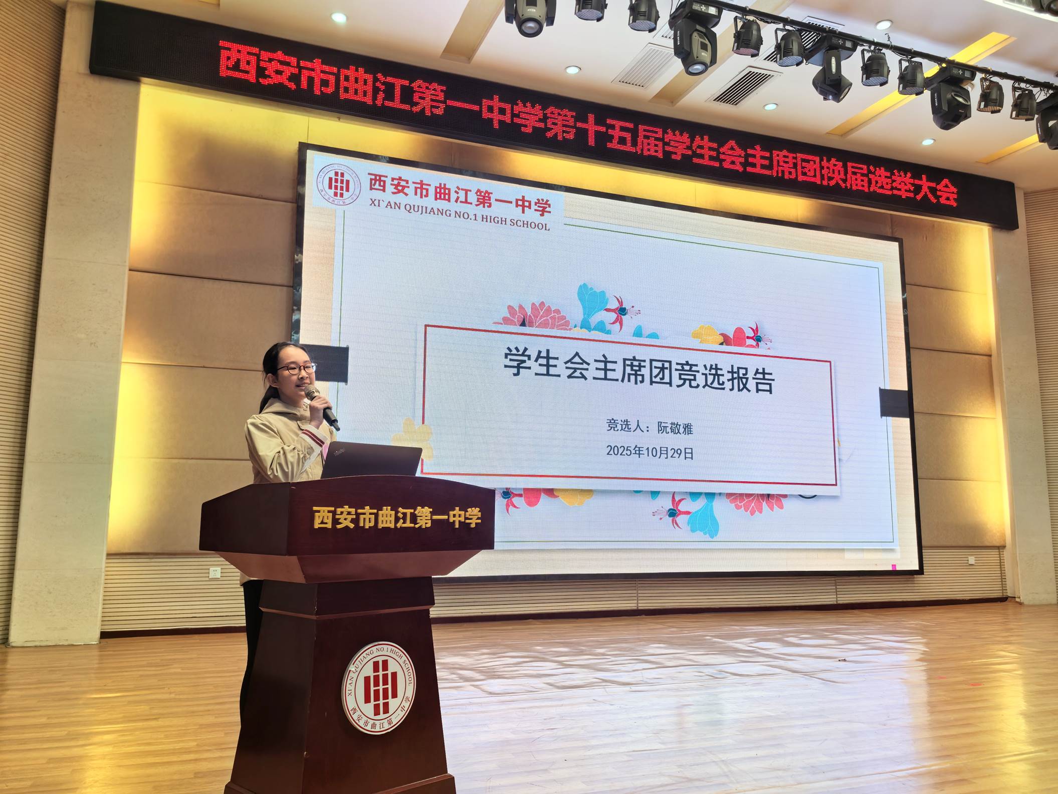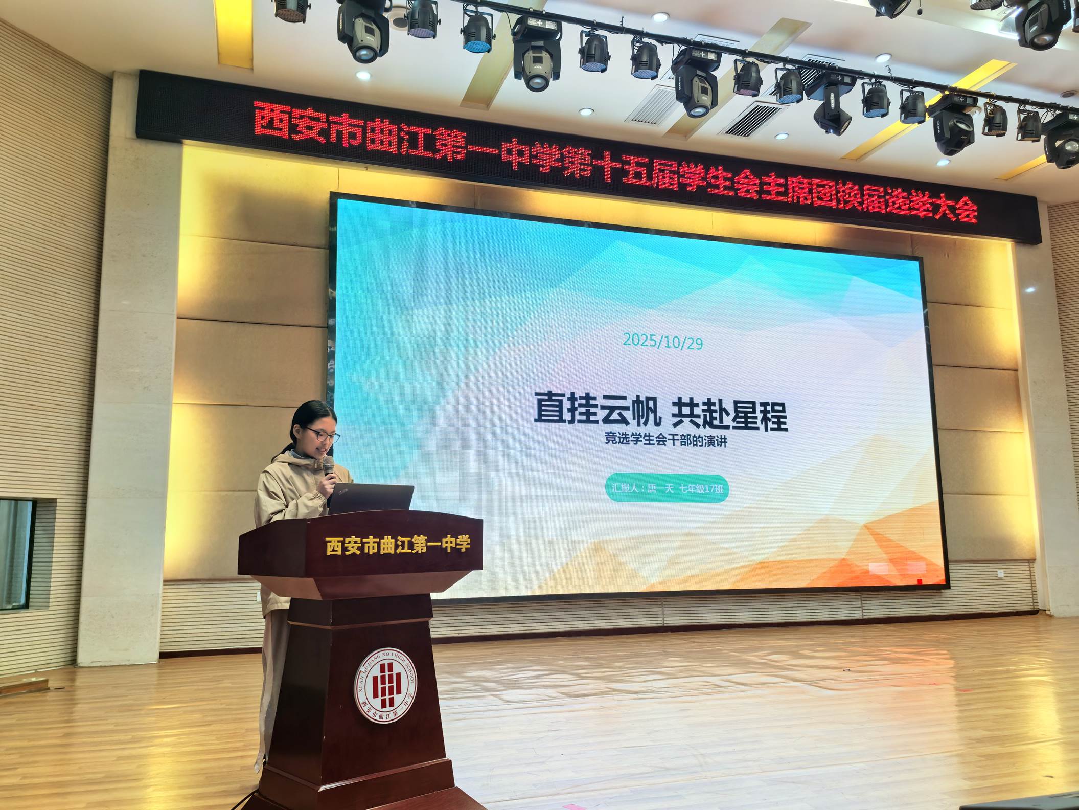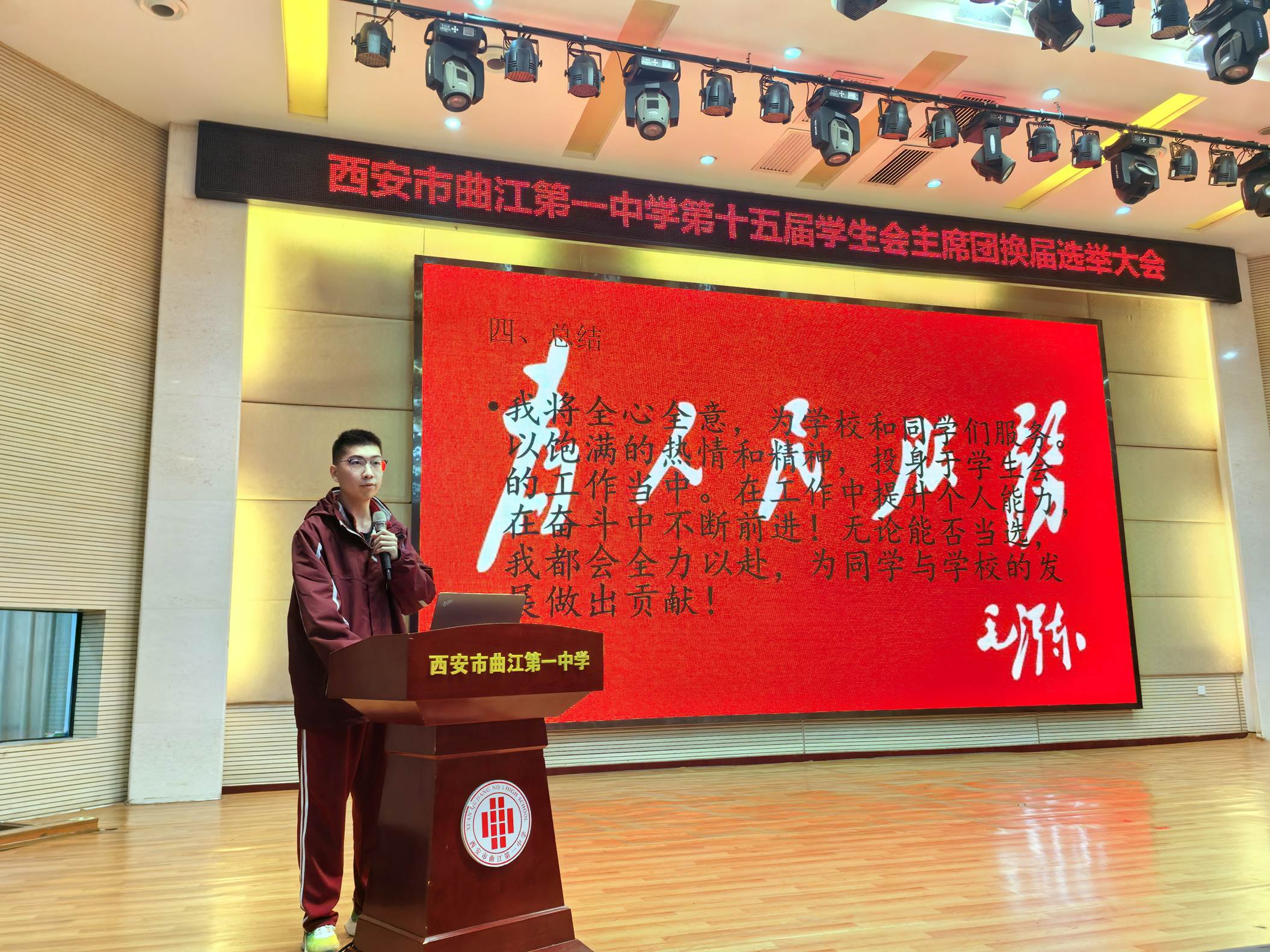 为更好地发挥学生自我教育、自我管理、自我服务的职能,2025年10月29日下午,西安市曲江第一中学第十五届学生会主席团换届选举大会在润德厅召开。曲江一中团委副书记高文昌,各年级教师代表及各班学生代表参加大会并参与投票。本次换届选举大会由团委老师陈妍主持。