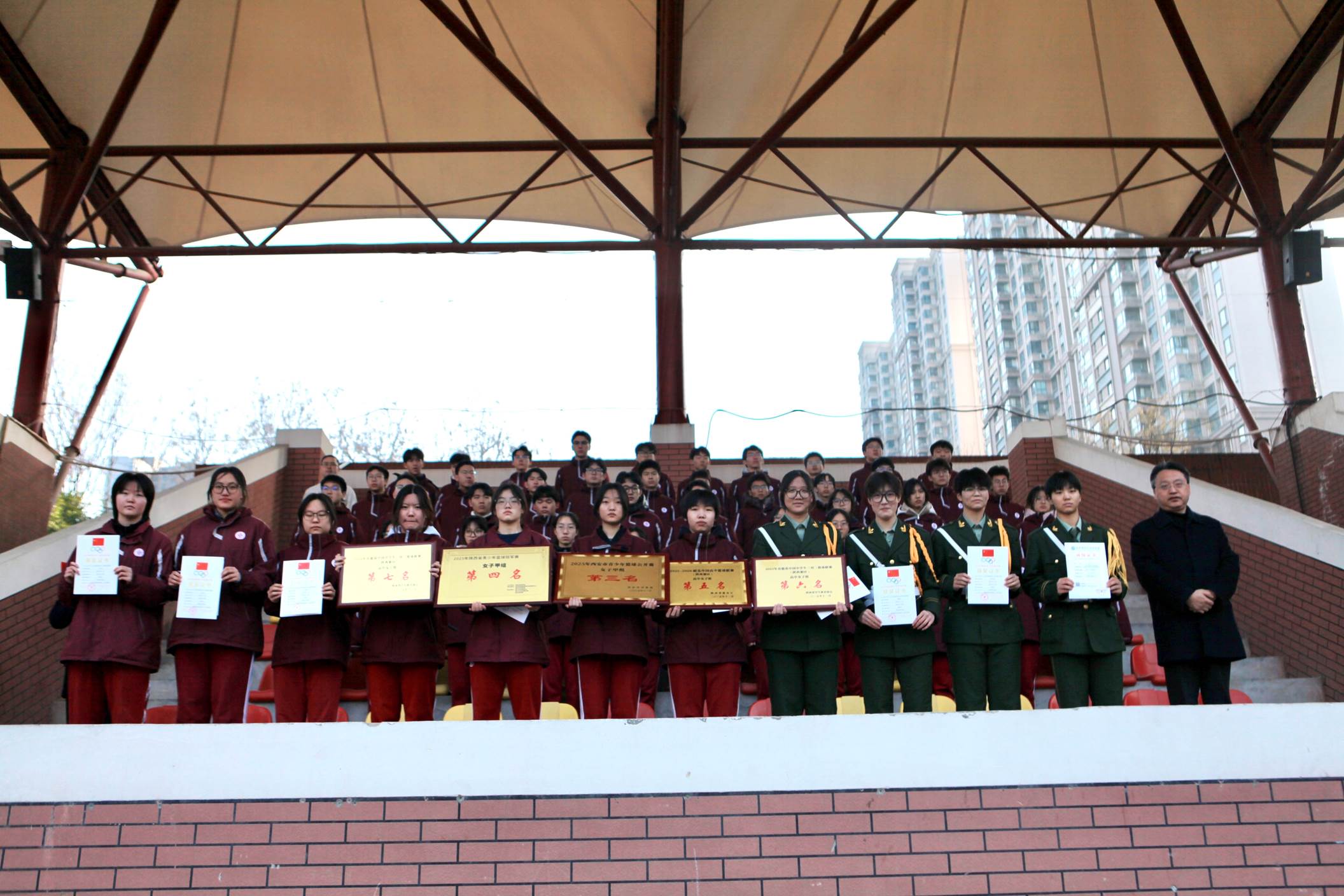 四、2025年12月12日,曲江一中高中女篮代表西安市赴铜川参加陕省体育局举办的2025年陕西省青少年篮球冠军赛,2名队员入选西安市一队获得女子甲组冠军,11名队员代表西安市二队获得女子甲组第四名。