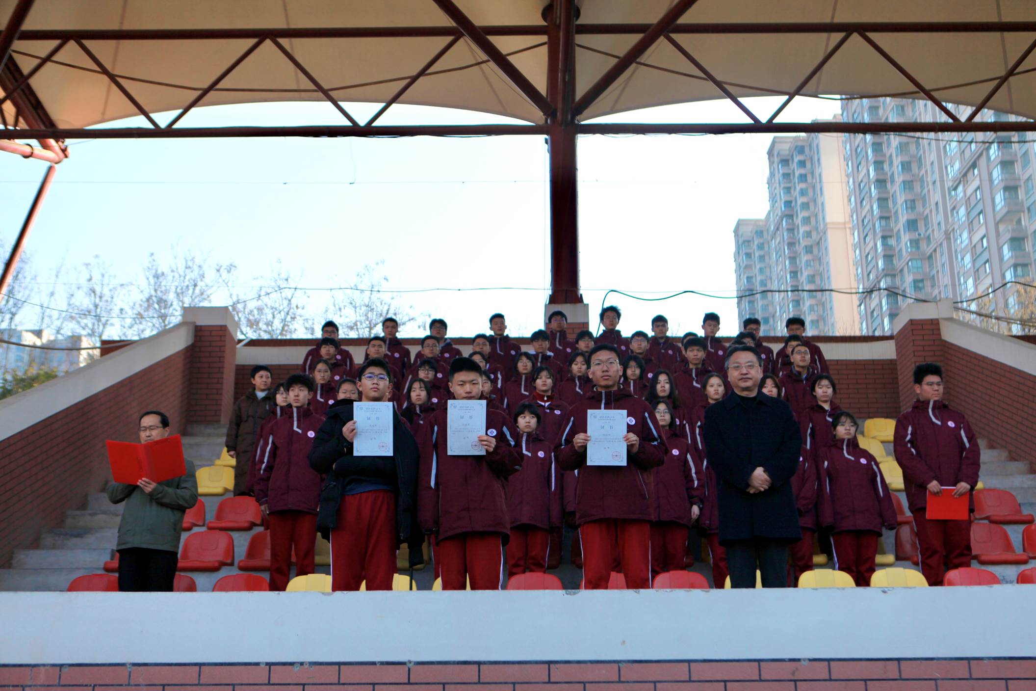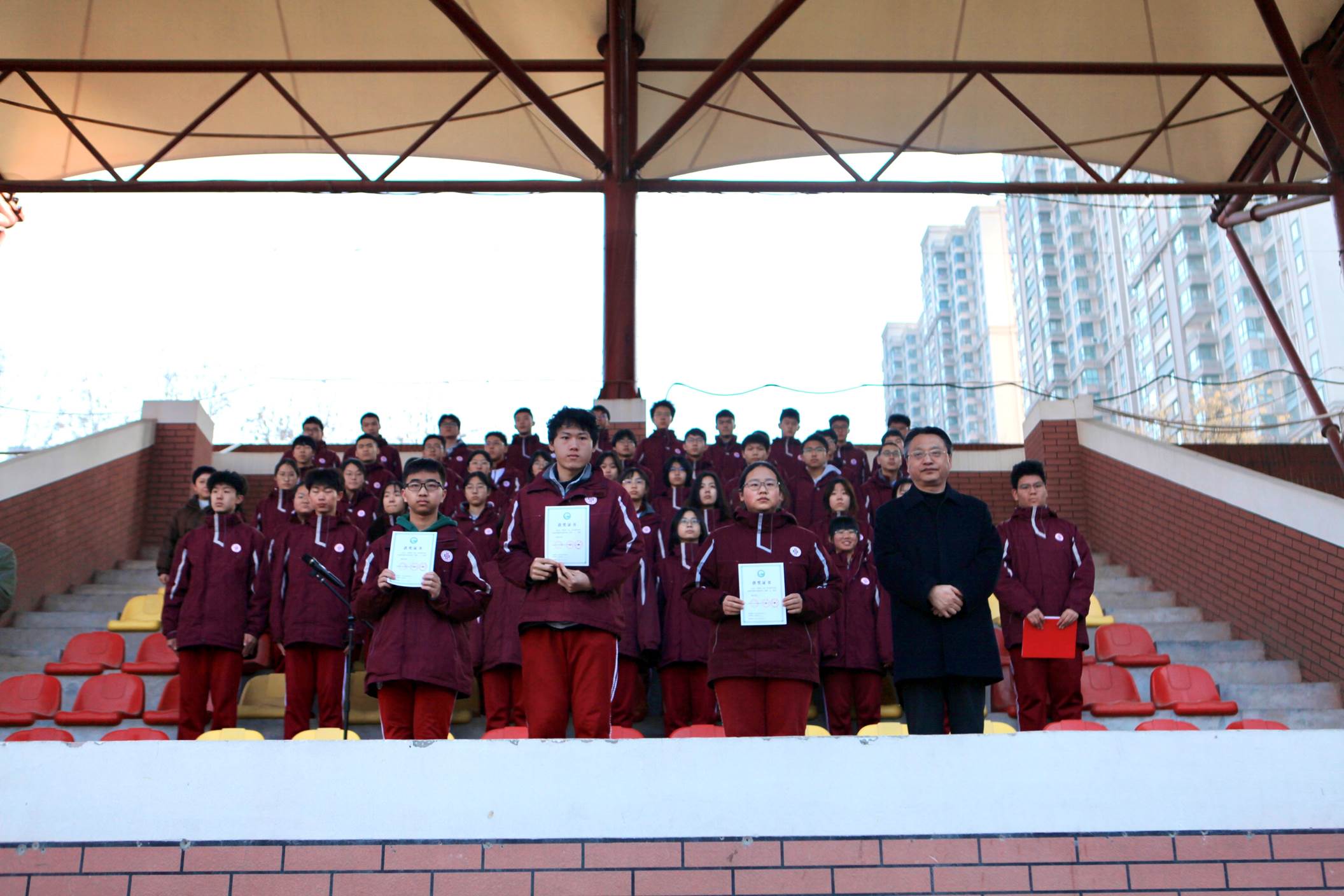 第三项,高2025级3班柴开源同学做一分钟英语演讲;第四项:宣读第20周获得“日常行为规范优秀班级”结果;第五项,宣读获奖消息,由校长陈勇刚为获奖学生颁发荣誉证书并合影留念。最后由高2025级1班吴亚楠、张云水同学领诵经典诵读文本《江城子·密州出猎》和曲江一中校训,嘹亮的诵读声响彻操场,豪迈的气势振奋人心。