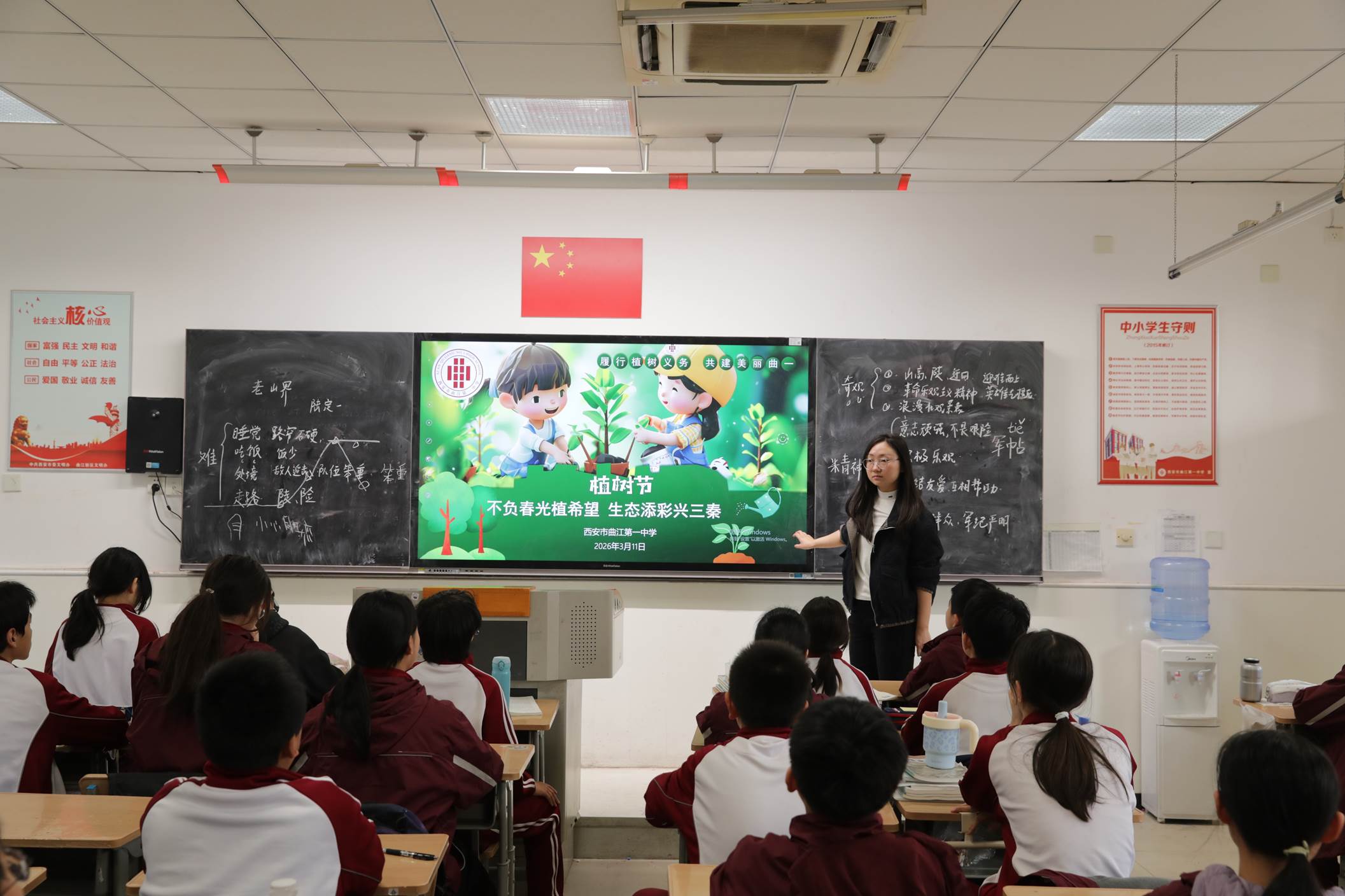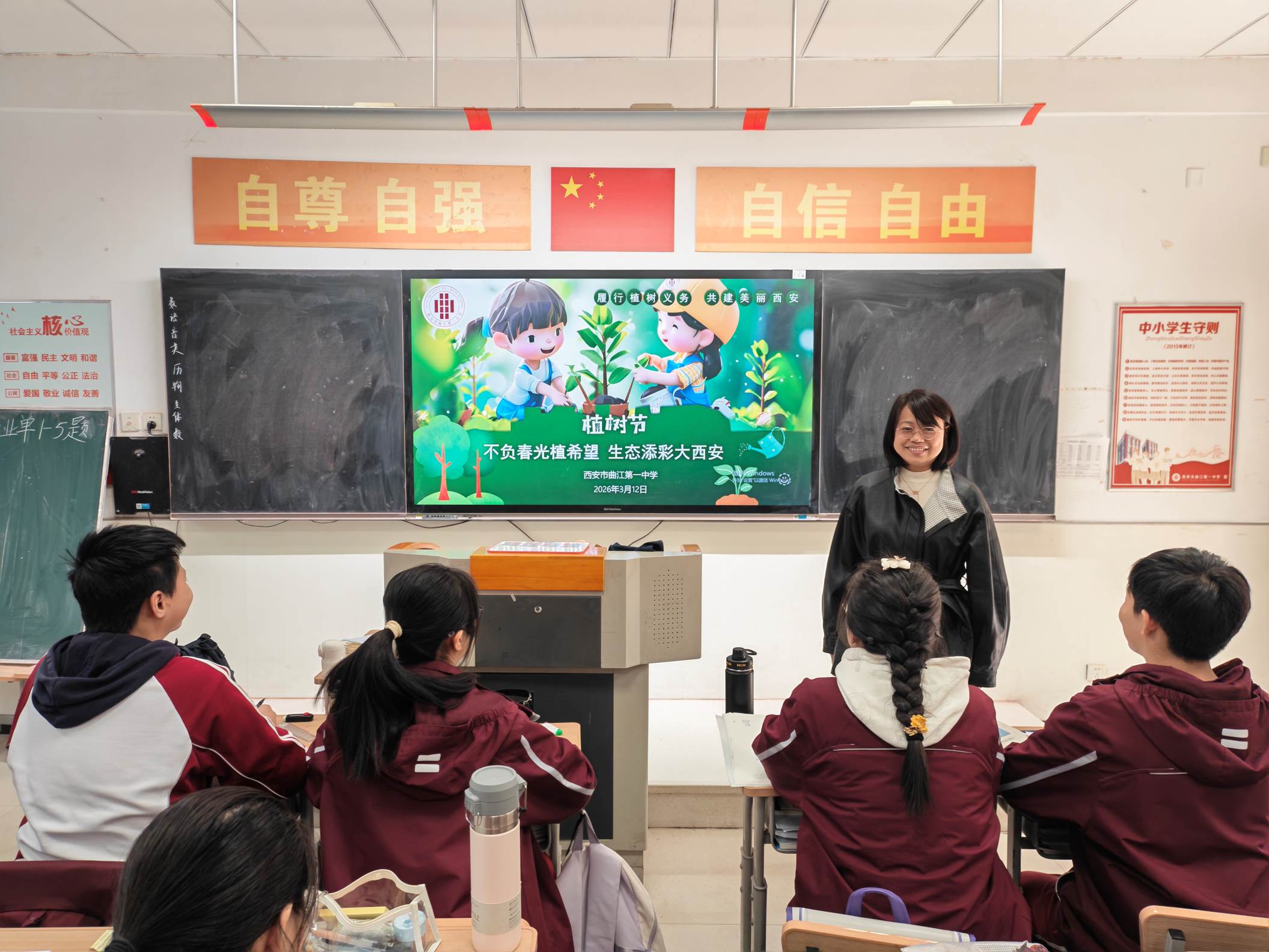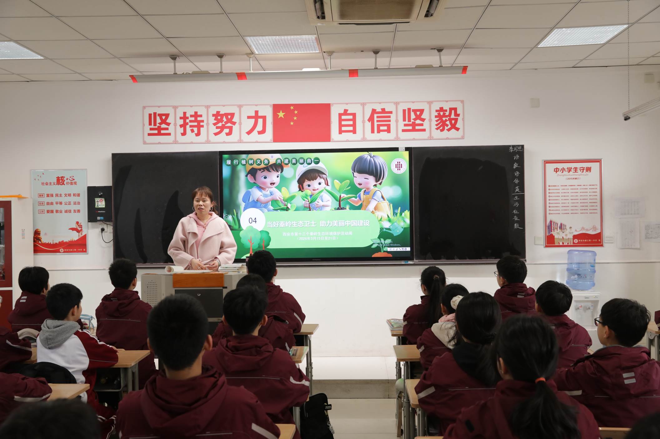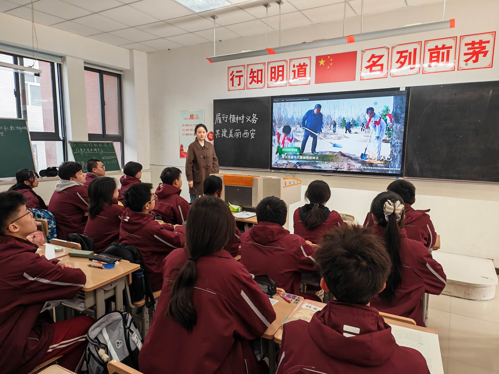2026年3月11日,初2025级年级组召开“不负春光植希望 生态添彩兴三秦”主题班会,24个班级同频共振,同学们学习“两山论”理念的提出与发展历程,观看《这件“有意义的事”总书记连续十余年身体力行》视频。同学们以“履行植树义务,共建美丽中国”为主题,绘制班级名片,营造浓厚的植绿、护绿、爱绿氛围,为美丽西安添彩。
