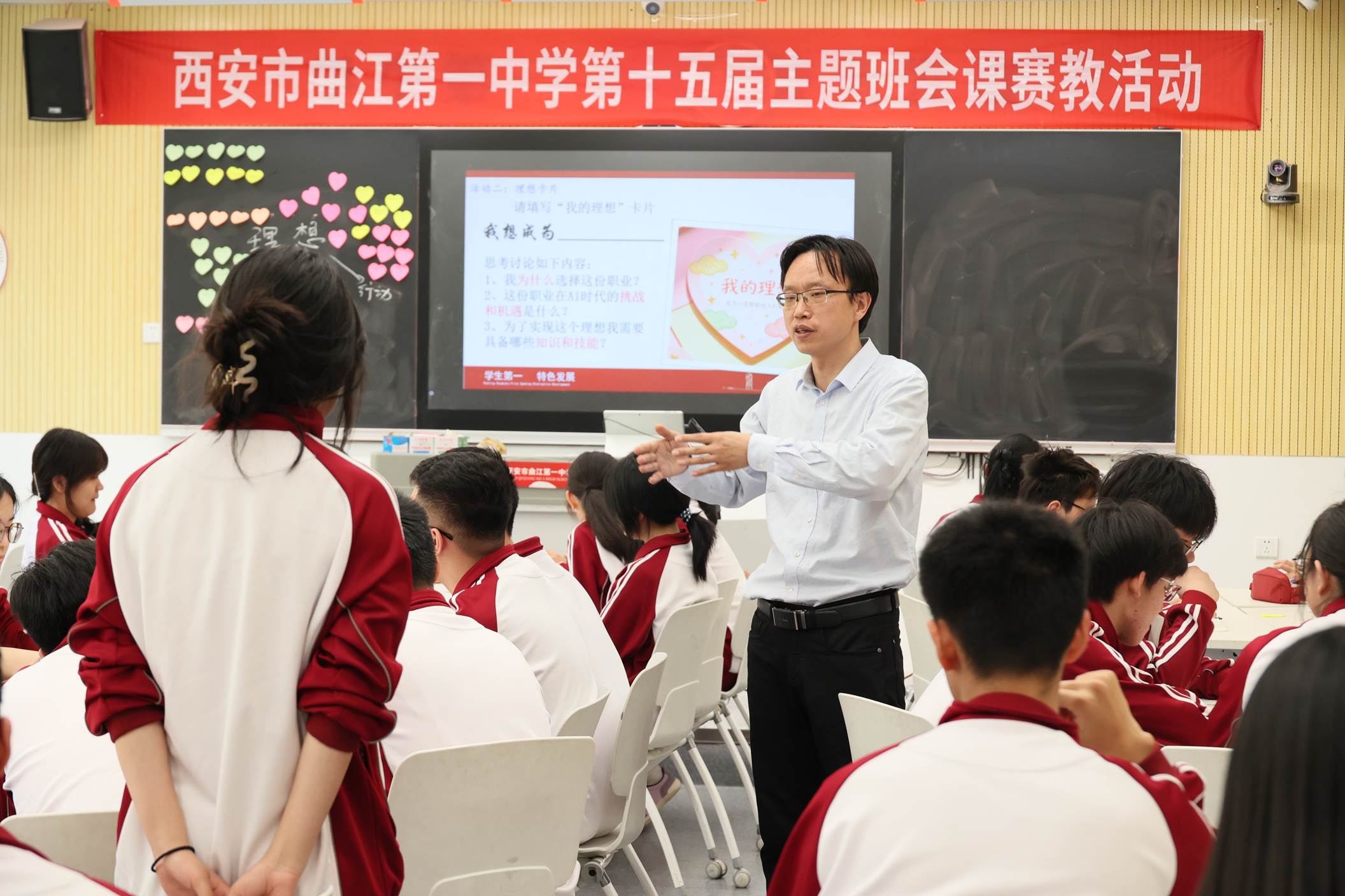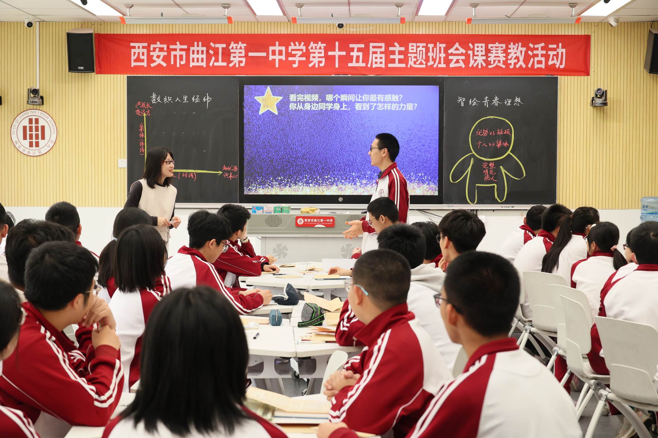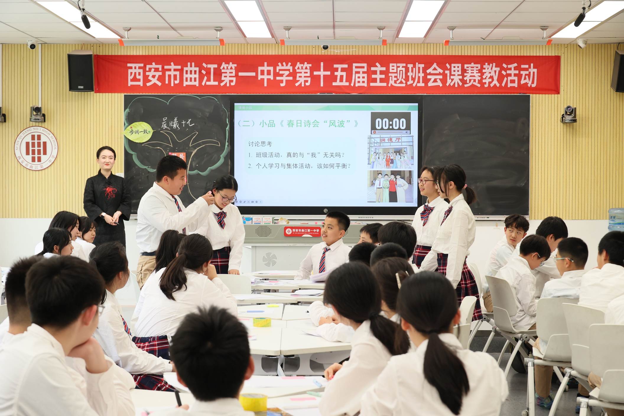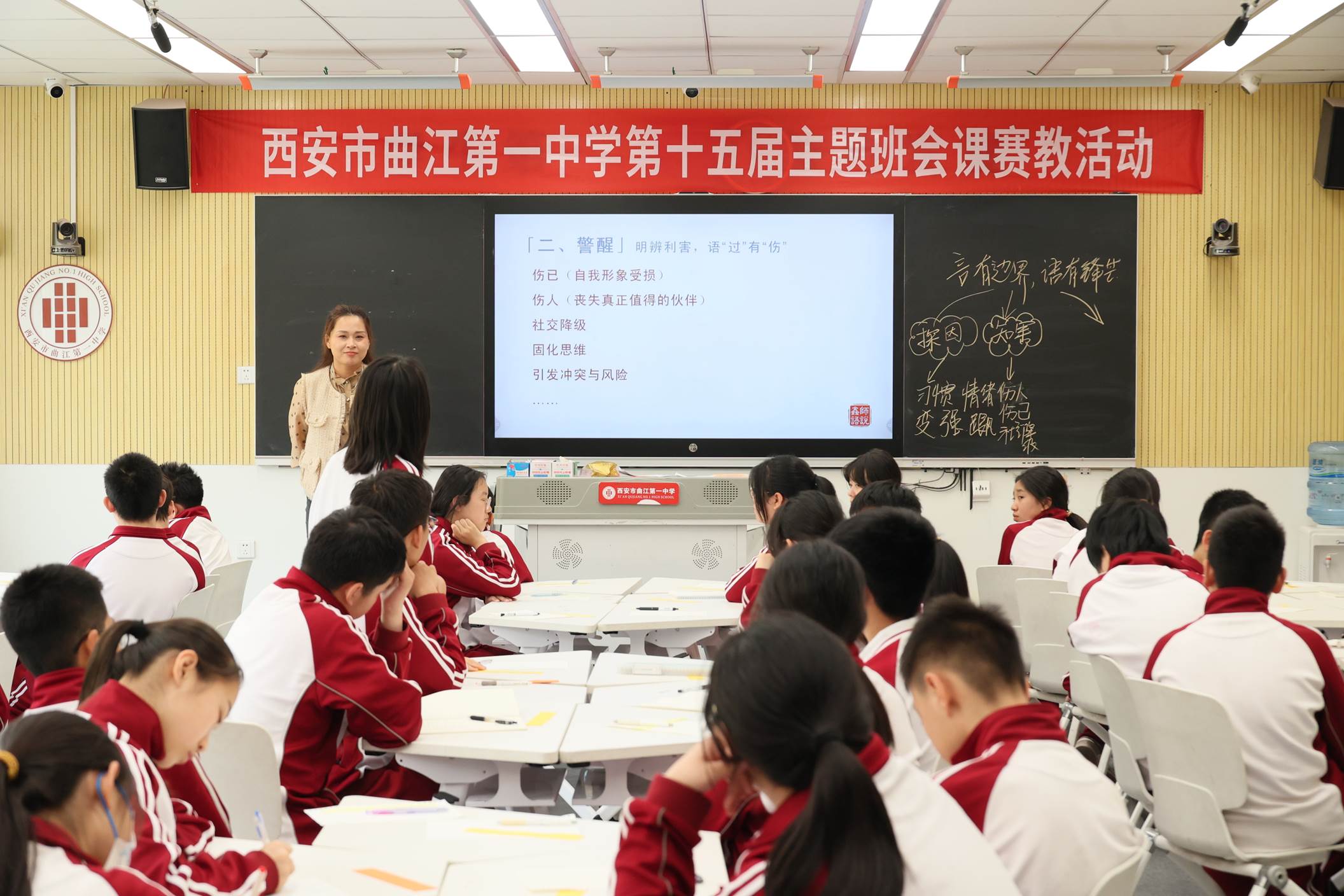 为持续深化学生德育工作,切实提升班主任的专业素养与育人能力,4月14日-15日,西安市曲江第一中学举办第十五届主题班会课赛教活动。全校各年级共12位班主任参赛。参赛教师以思维型教学理论为指导,以明确的育人目标为导向,通过创设丰富多元的教学情境,推动学生在主动参与和情感共鸣中实现认知建构与品德养成,有效促进综合素养的提升。活动邀请西安市临潼区雨金中学、阎良区武屯中学、阎良区西飞第二中学教师现场观摩,并向全校教师进行直播。