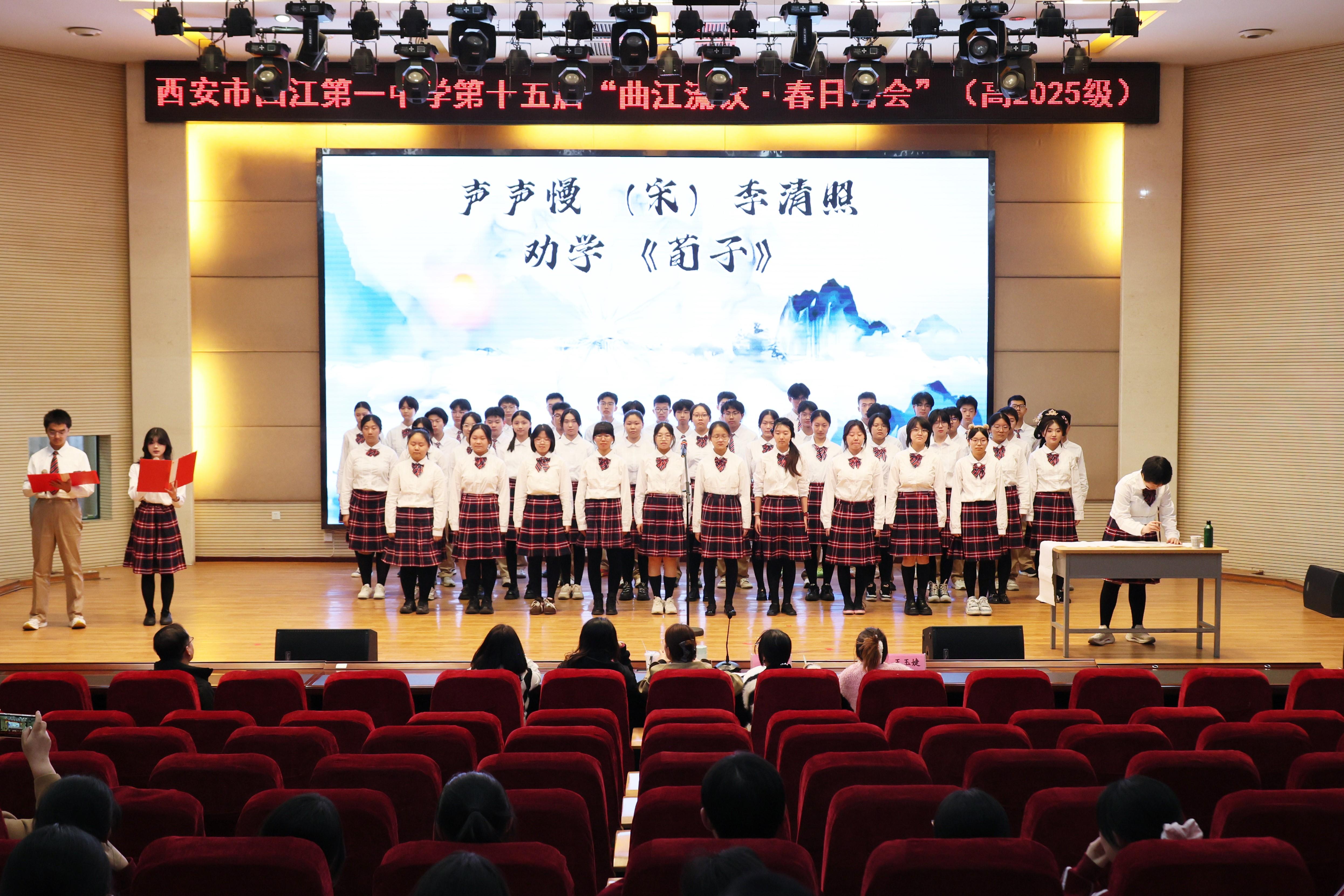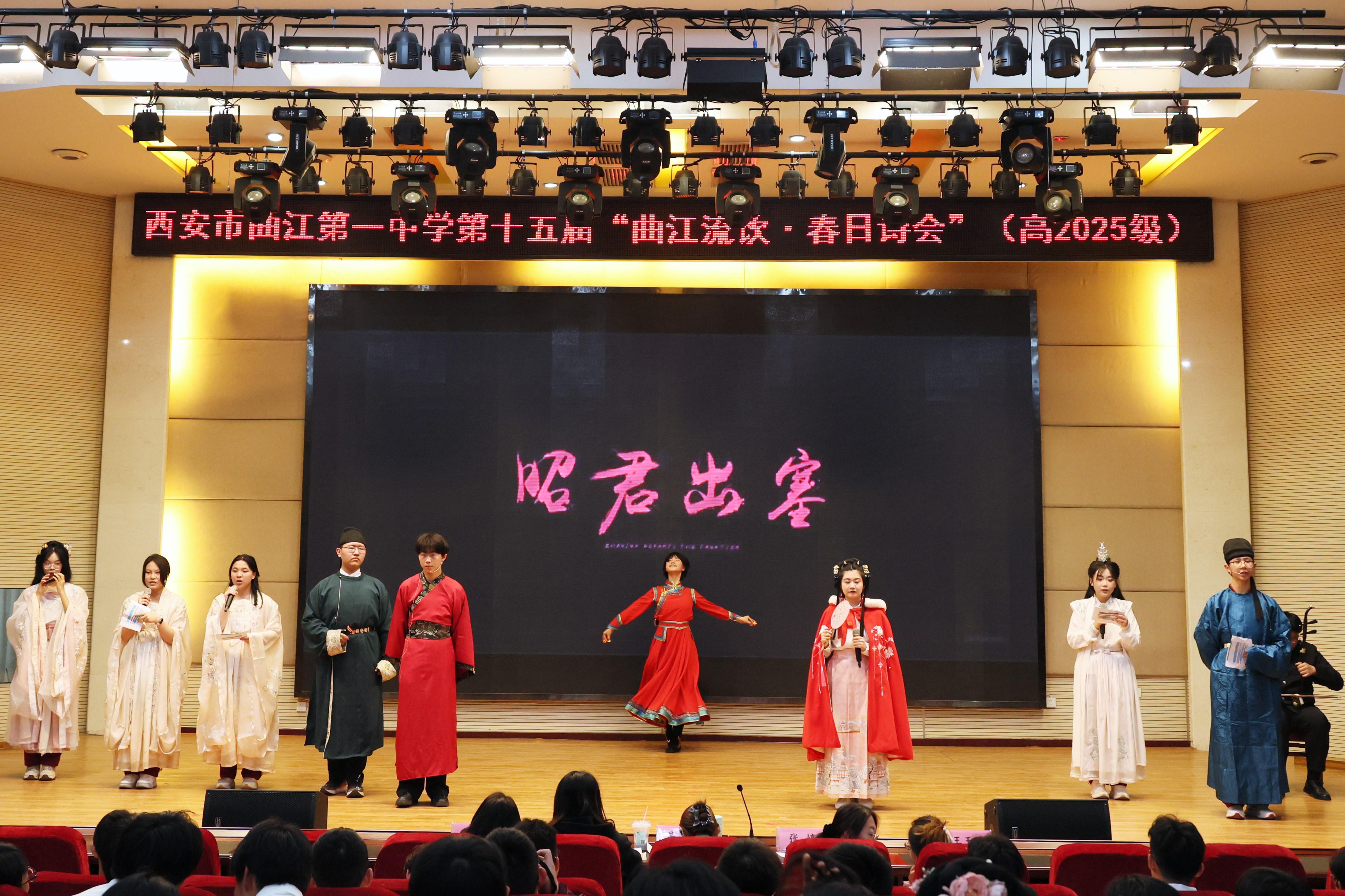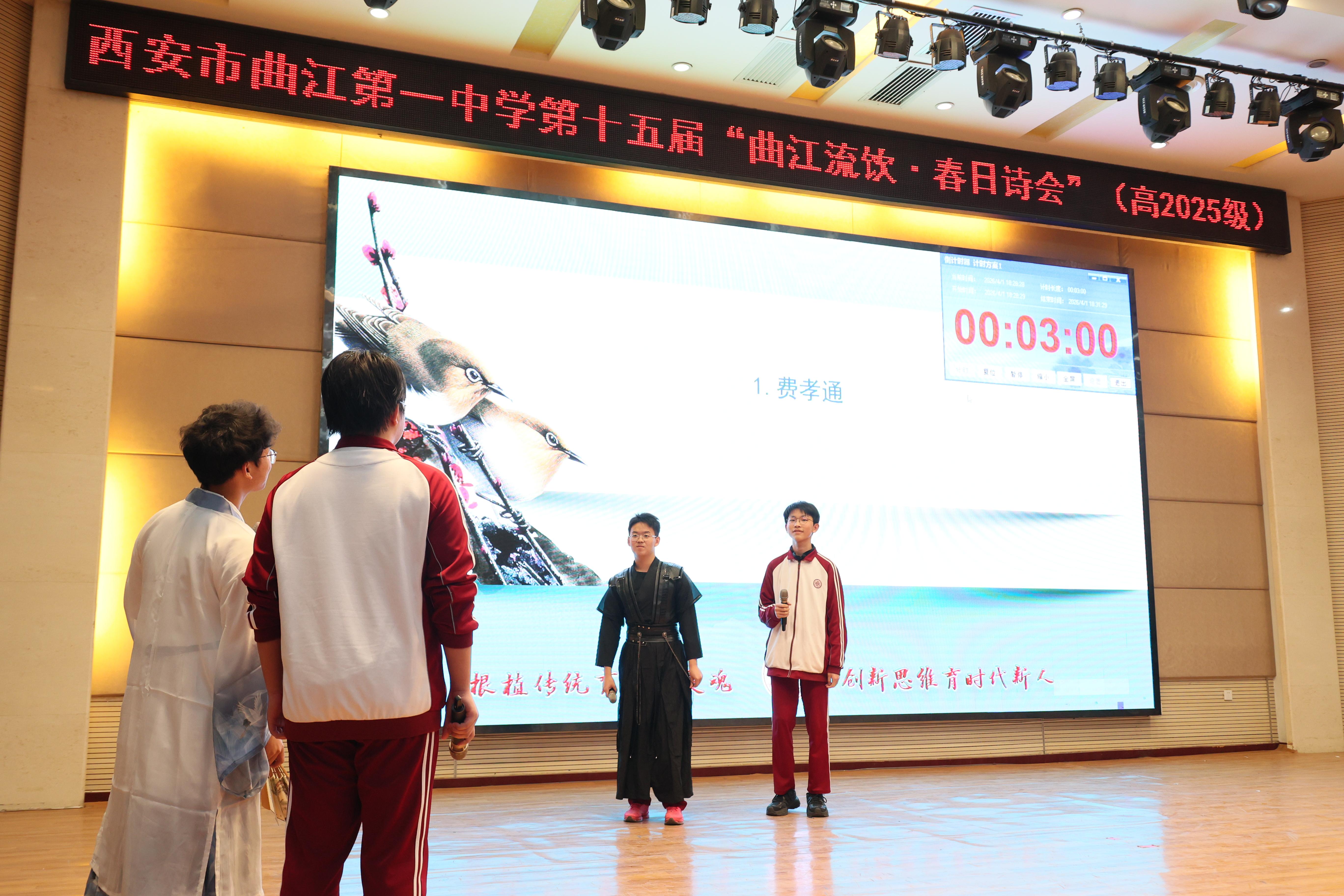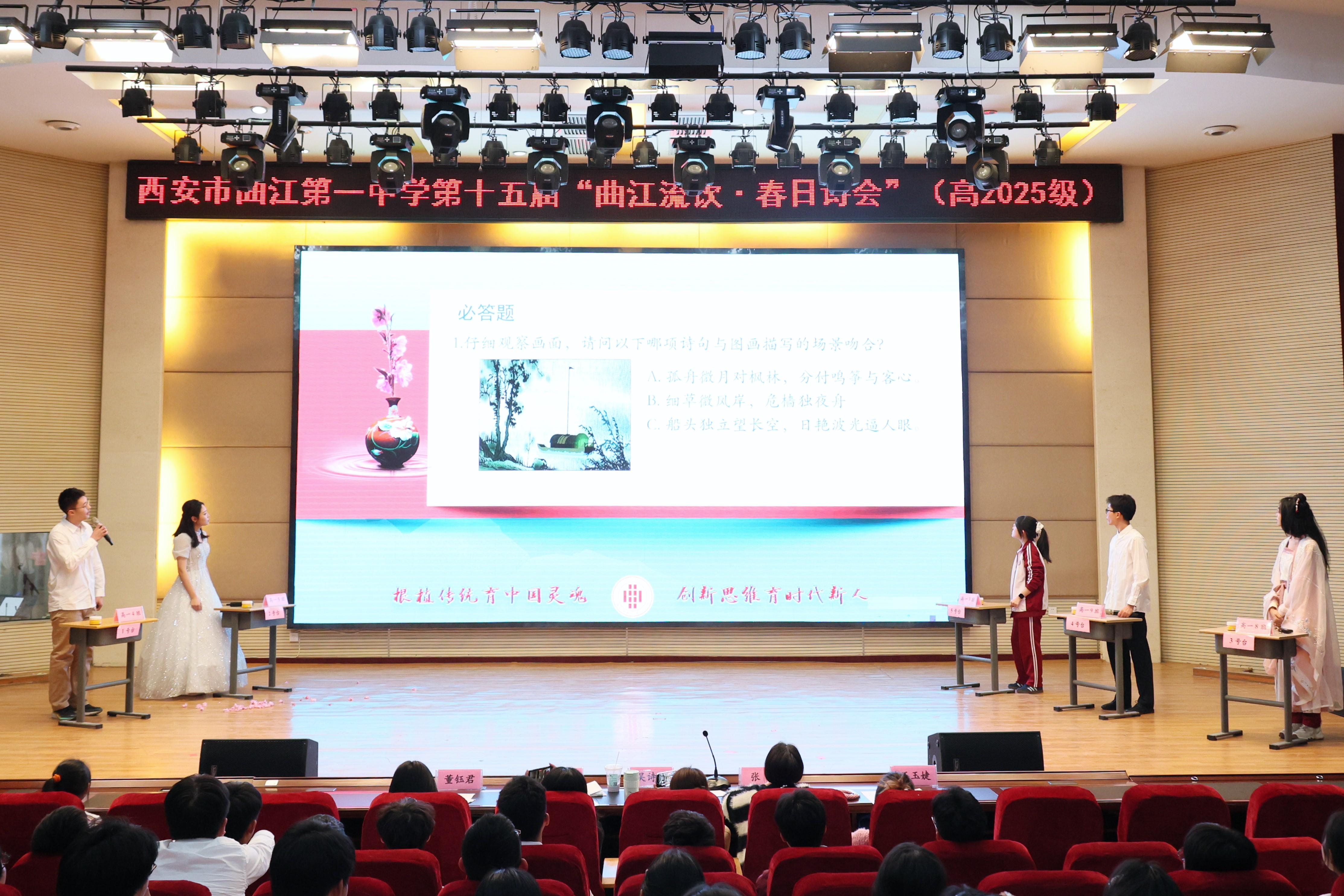 近日,西安市曲江第一中学举行第十五届曲江流饮・春日诗会(高2025级)。曲江一中政教处副主任董锋,高2025级年级组长王海军、各班班主任及高2025级全体同学参加活动。语文教研组长陈思嘉,语文教师吴诗泽、卜文利、王玉婕、董钰君、张婷、张莉莉、乔亚龙、石燕聪担任评委。本次诗会分为集体诵读、心有灵犀、创意经典、风险抢答四个环节。同学们以诵传情、以艺释典,共同奏响中华经典诗文的青春乐章。
