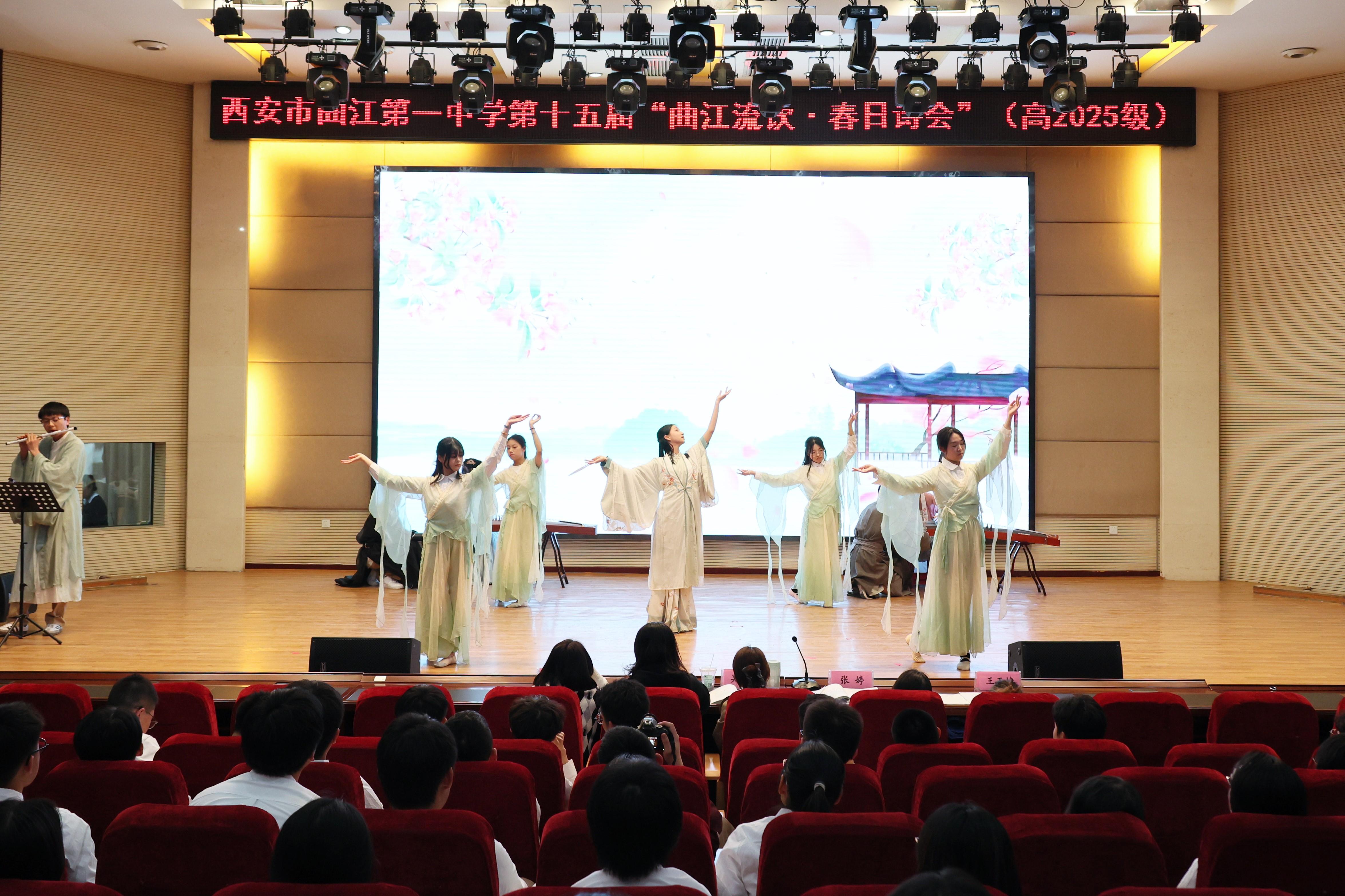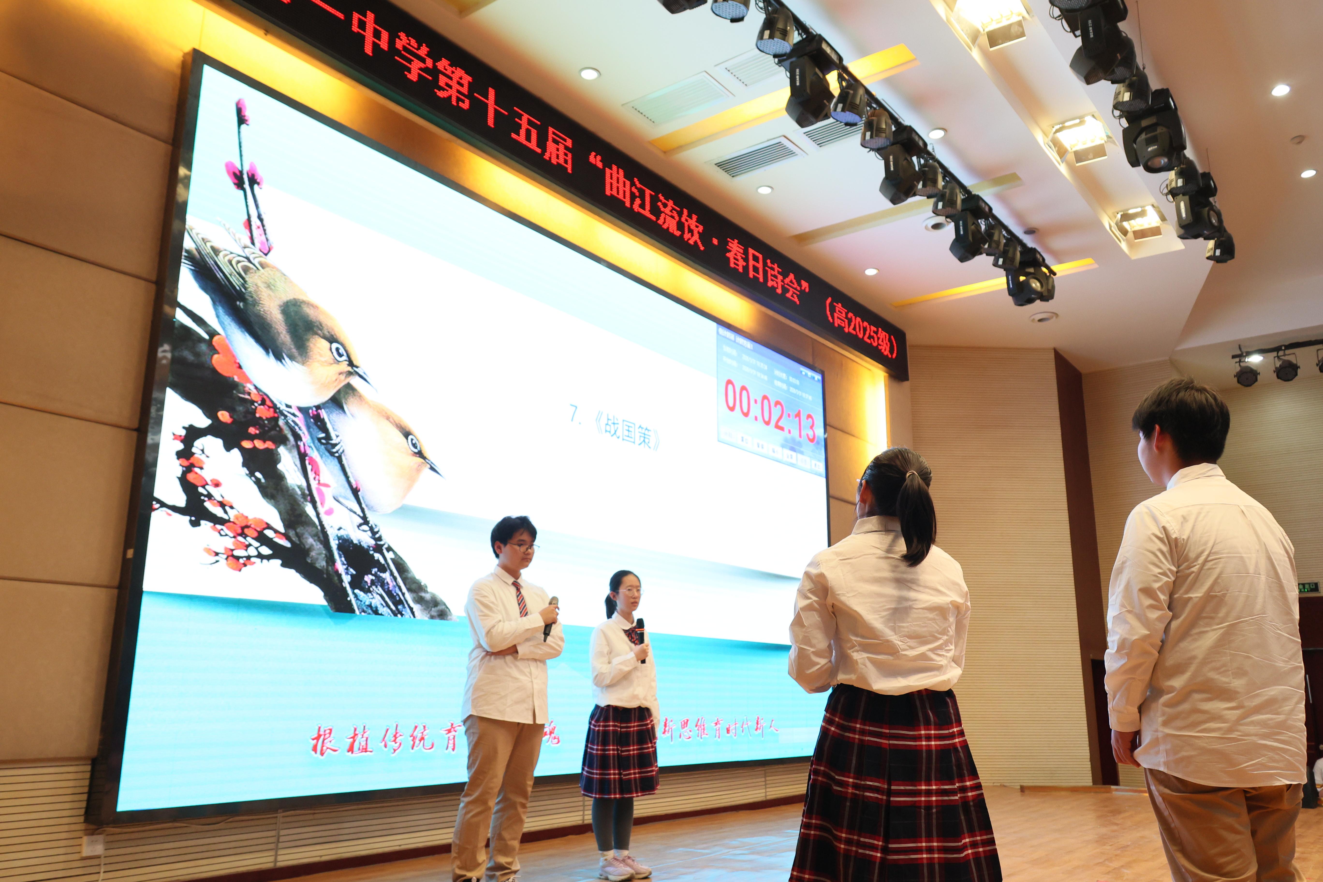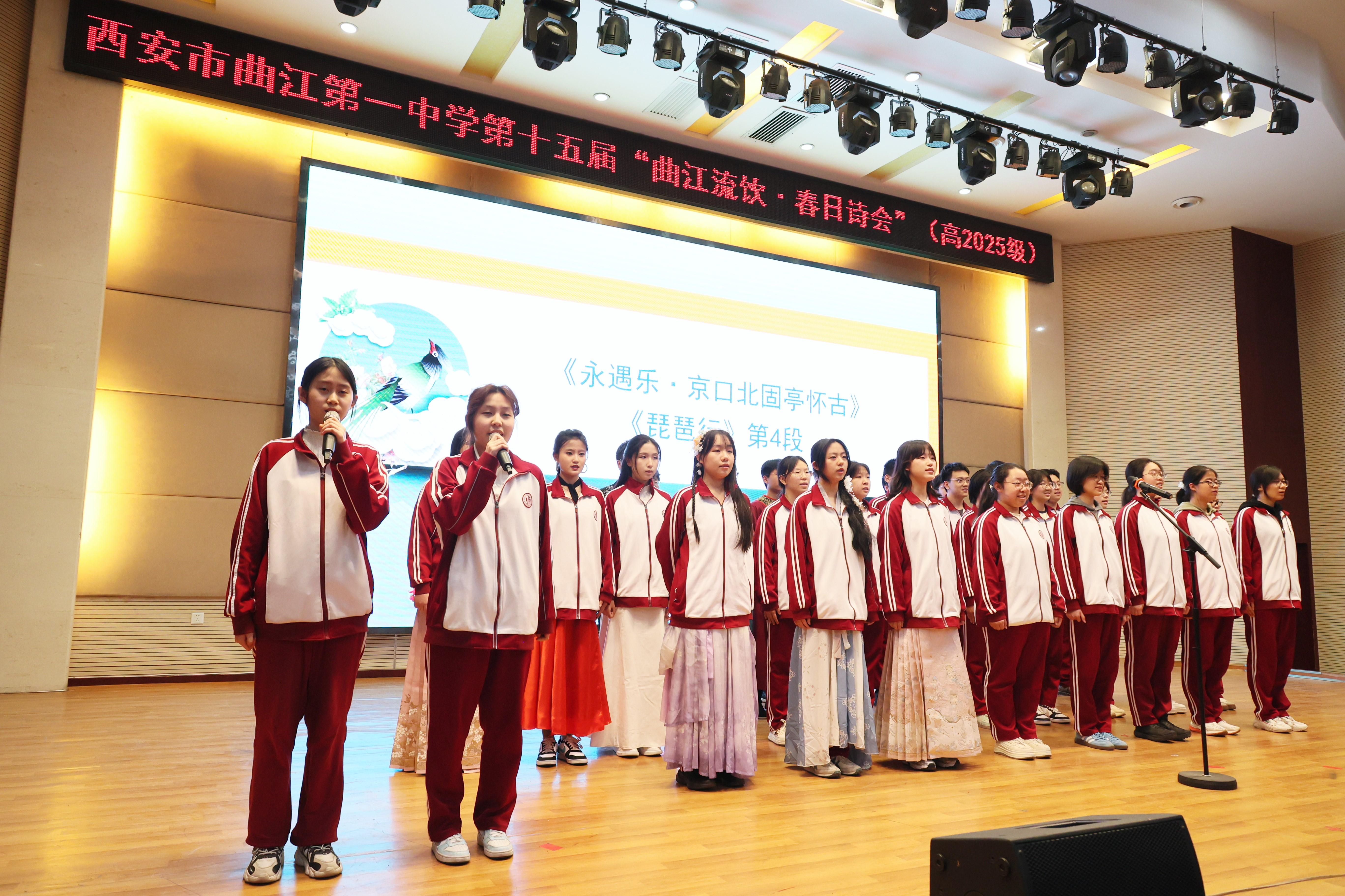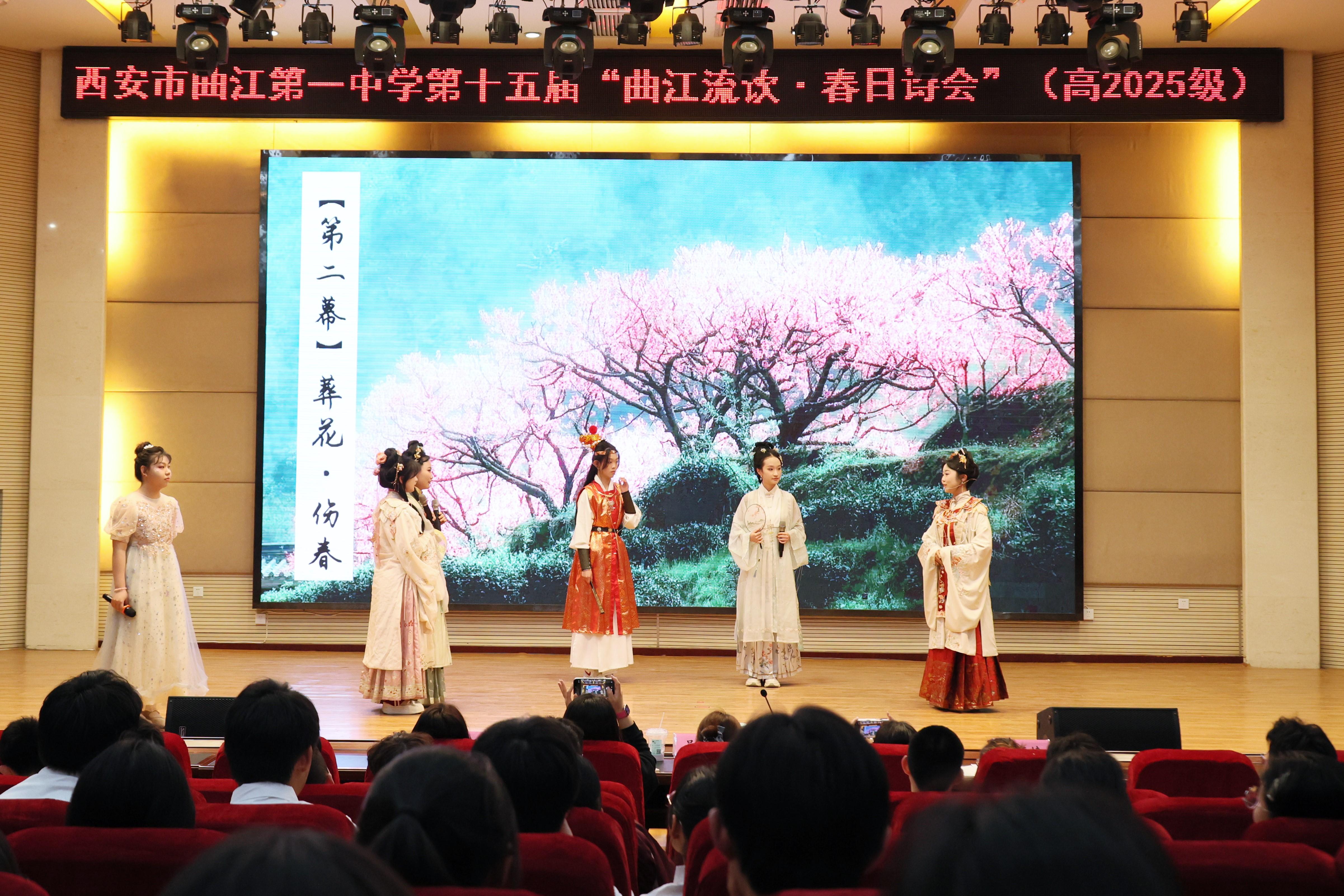 近日,西安市曲江第一中学举行第十五届曲江流饮・春日诗会(高2025级)。曲江一中政教处副主任董锋,高2025级年级组长王海军、各班班主任及高2025级全体同学参加活动。语文教研组长陈思嘉,语文教师吴诗泽、卜文利、王玉婕、董钰君、张婷、张莉莉、乔亚龙、石燕聪担任评委。本次诗会分为集体诵读、心有灵犀、创意经典、风险抢答四个环节。同学们以诵传情、以艺释典,共同奏响中华经典诗文的青春乐章。