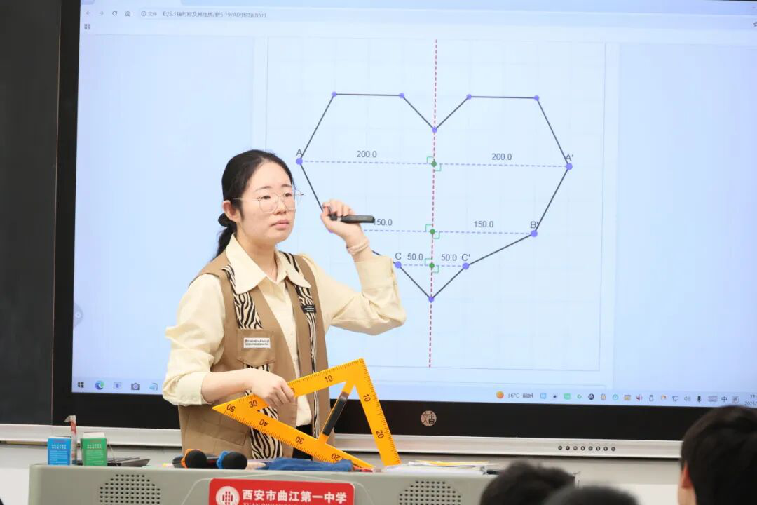 在《轴对称及其性质》的教学中,徐璐琳老师以生活实例作为切入点,引导学生发现对称之美。课堂上,徐老师带领学生开展折纸实验,探究“完全重合”的原理。同时,结合DeepSeek进行动态演示,将图形的对称过程直观地呈现出来。随后,学生自主设计轴对称图形,以此验证对称轴的性质。在小组合作阶段,同学们通过测量、推理等方式,归纳出对称规律。在实践环节,学生通过补全残缺图形的练习,锻炼自身的空间想象能力。