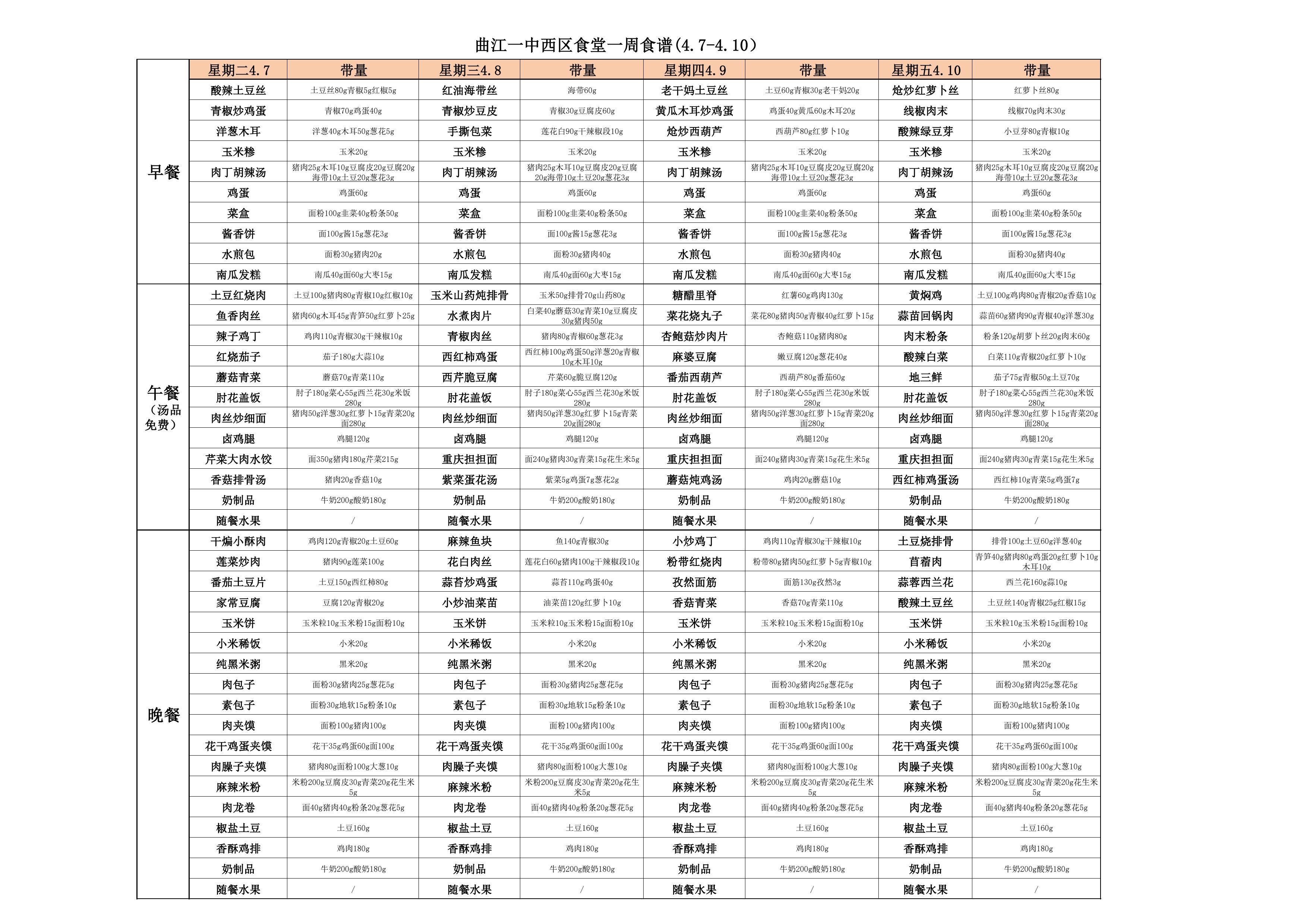 曲江一中食堂一周带量食谱(4.7-4.10)