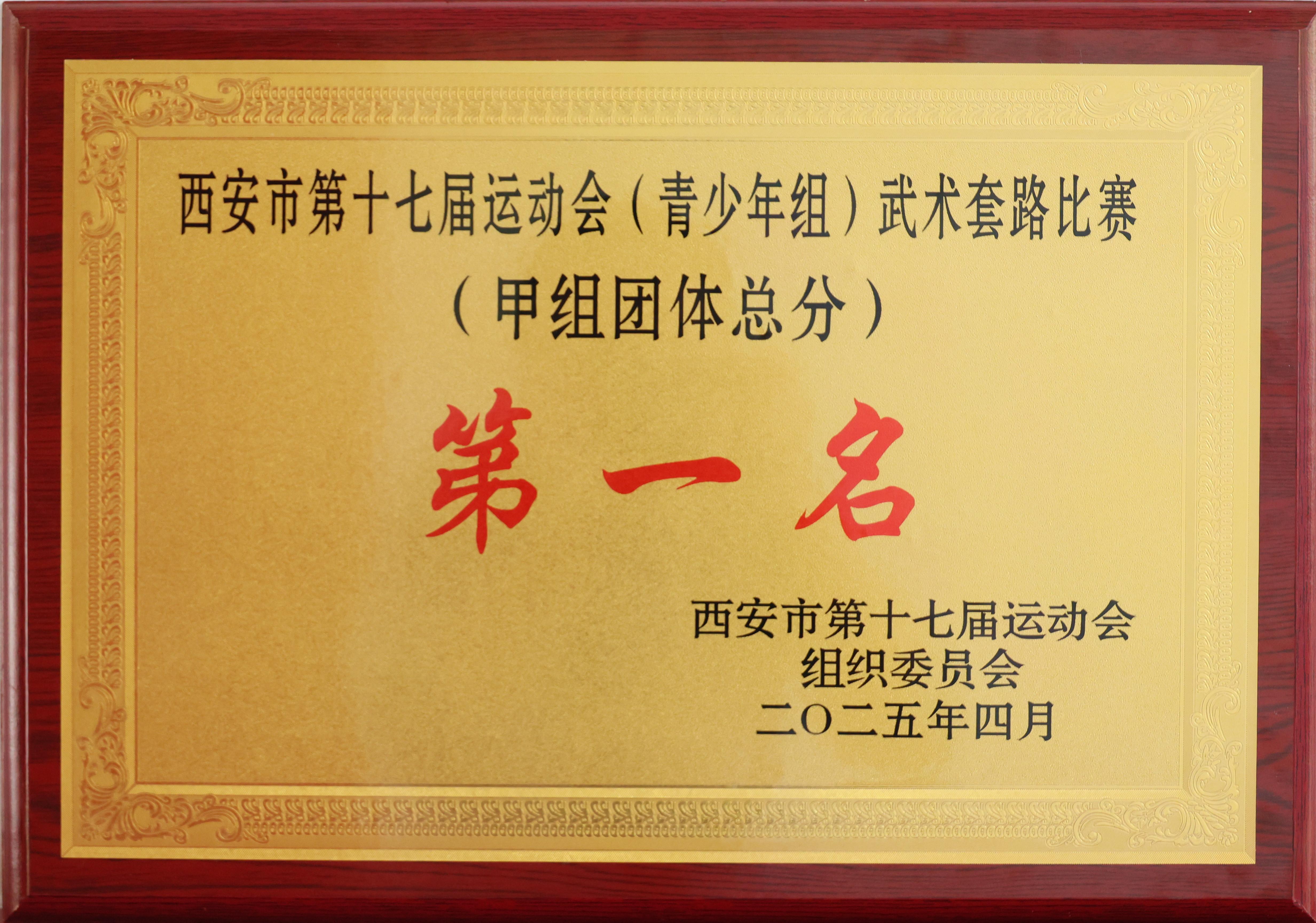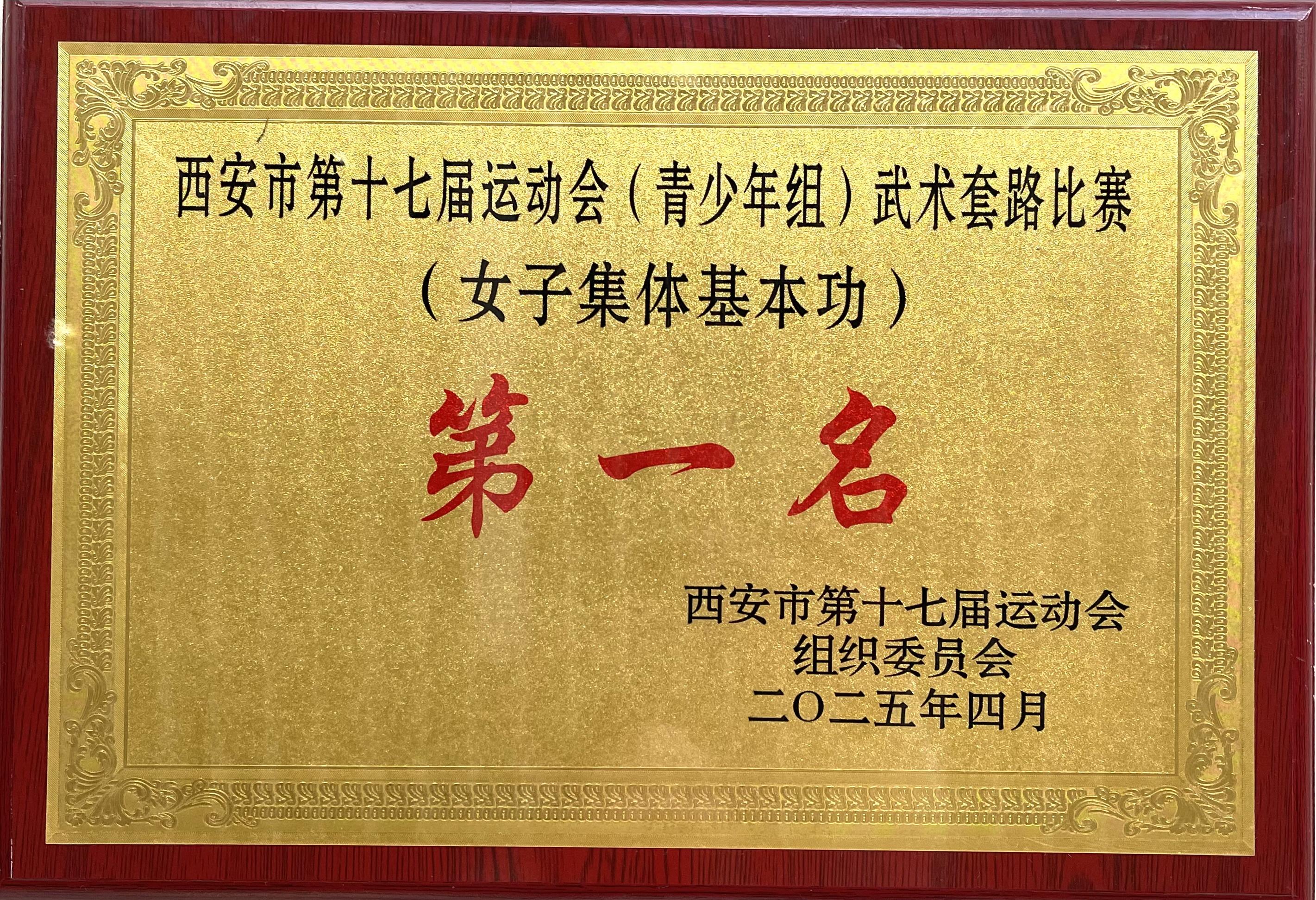 2025年4月,西安市曲江第一中学荣获西安市第十七届运动会(青少年组)武术套路比赛甲组团体总分第一名、男子集体基本功第一名、女子集体基本功第一名