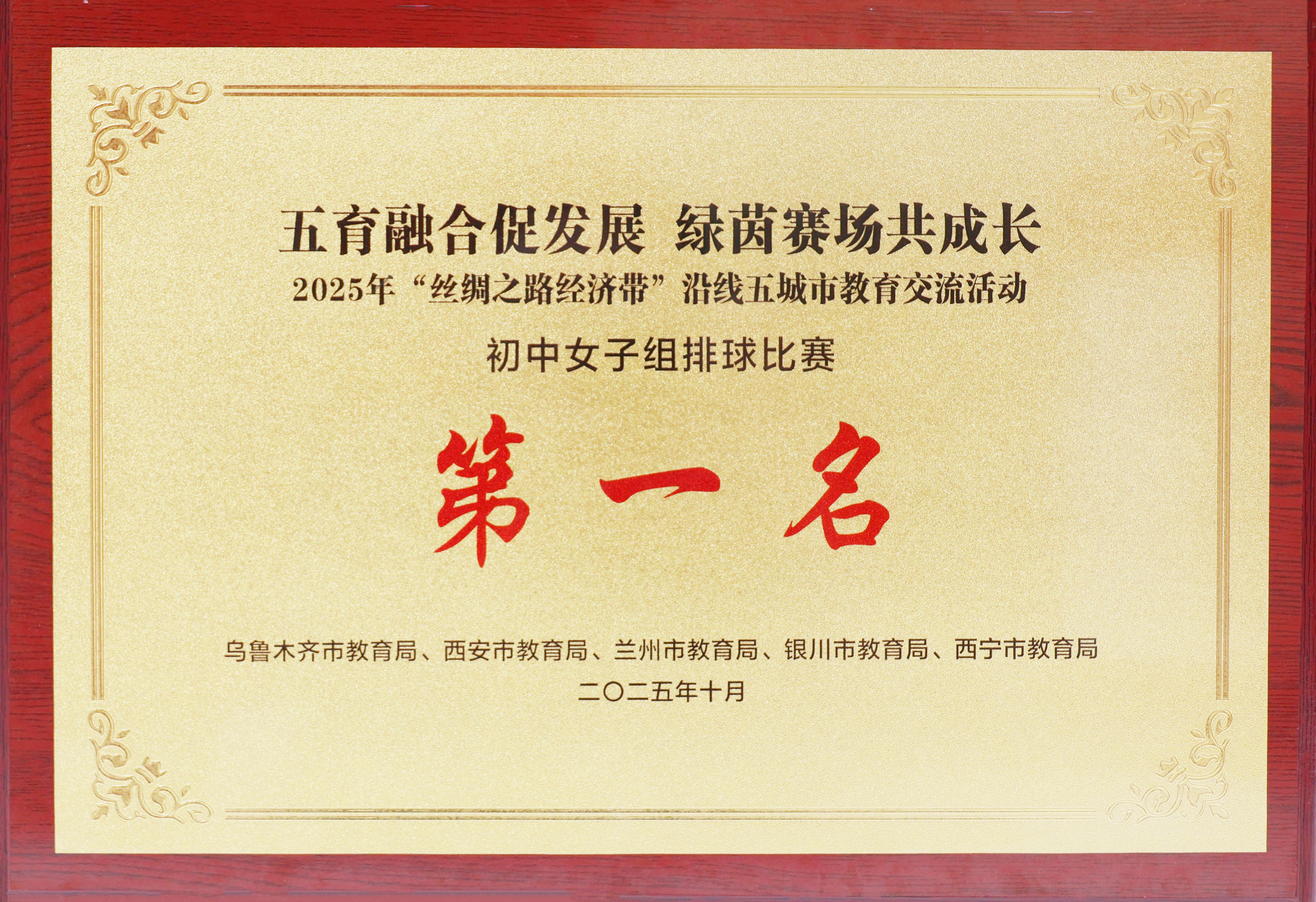 2025年10月,西安市曲江第一中学荣获2025年“丝绸之路经济带”沿线五城市教育交流活动初中女子排球比赛第一名