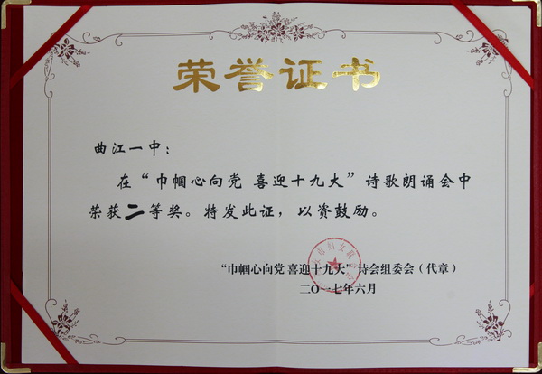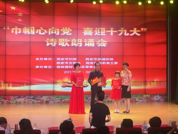 6月30日下午15时,由市妇联、市委组织部、市文明办、市直机关工委联合主办,国际港务区承办的“巾帼心向党 喜迎十九大”诗歌朗诵会隆重举行,各界妇女代表、最美家庭代表近300人参加了本次朗诵会,用情感真挚的诗歌朗诵向建党96周年献礼。由我校苏岳、杨帆、武媛莹、乔亚龙、彭玲、陈思嘉六位老师代表曲江新区参赛朗诵的青春诗歌《诗意中国》荣获二等奖。