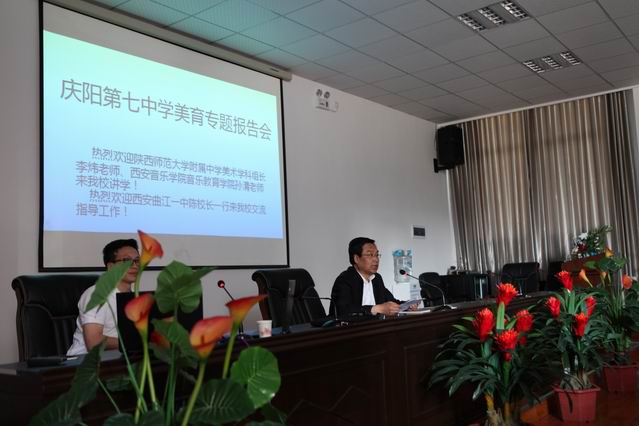 为做好陕西师范大学“美丽园丁教育基金会支持庆阳革命老区基础教育质量提升协同创新计划”之西安市曲江第一中学共建帮扶庆阳第七中学项目,2017年6月12-14日,曲江一中常务副校长陈勇刚、西安音乐学院音乐教育系孙清老师、陕西师大附中美术学科组长李炜老师、曲江一中艺术教研组组长黄晨老师、舞蹈教师王璐一行5人赴甘肃庆阳第七中学进行艺术教学交流研讨活动。