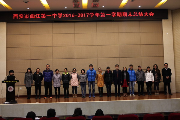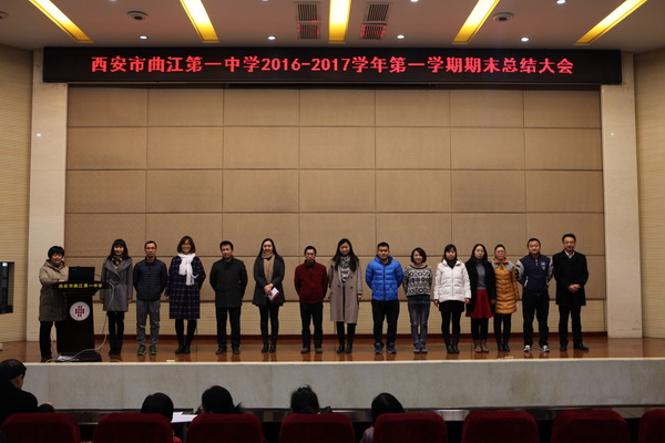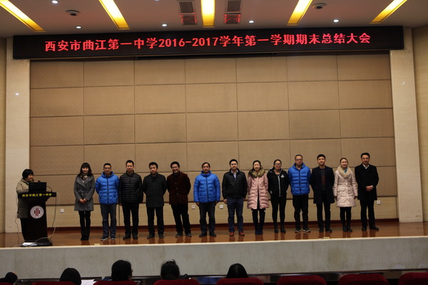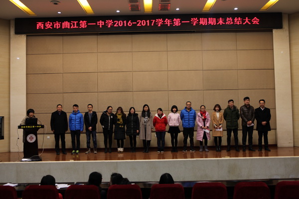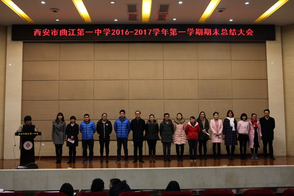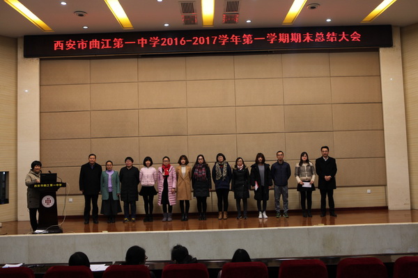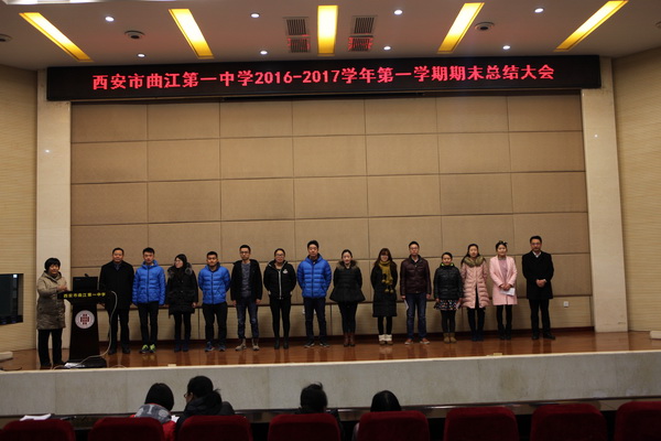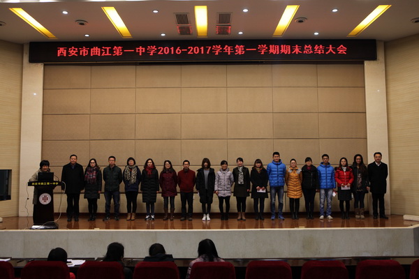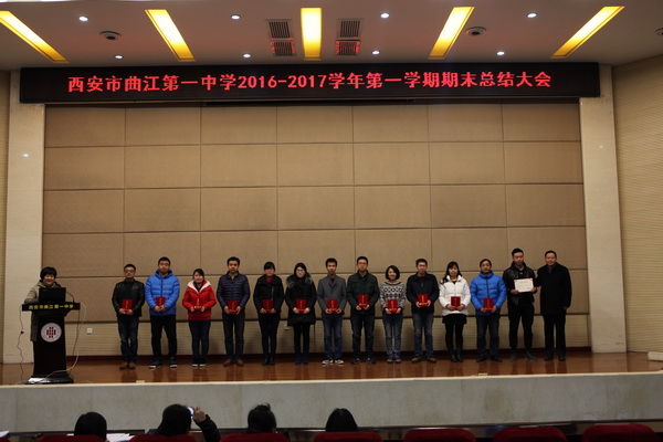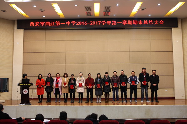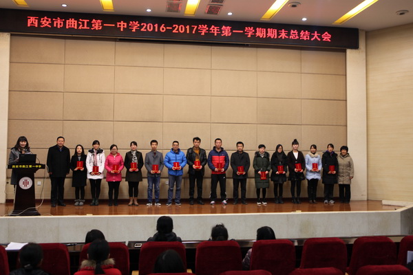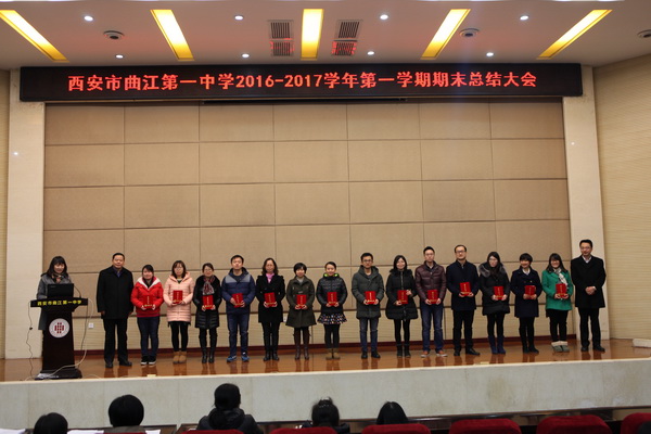 随后副校长曹琦宣读西安市曲江第一中学关于表彰2016年优秀教职工的决定,白璇、陈金叶、蔡晓梅等52位老师荣获本学年年度考核优秀教职工奖;大会第三项,副校长朱琳瑛宣读了教学教研类各项获奖情况,边团结校长、陈勇刚常务副校长及曹琦副校长为本学期获得“陕西省中小学教学能手称号”的英语教师张亚权、音乐教师黄晨以及本学年在国内外期刊上发表论文、承担课题研究及第七届赛教活动、各类教育教学成果获奖老师颁奖。