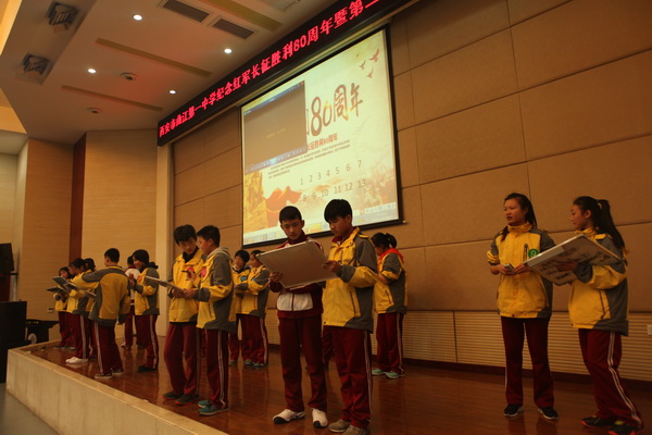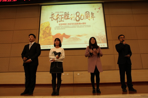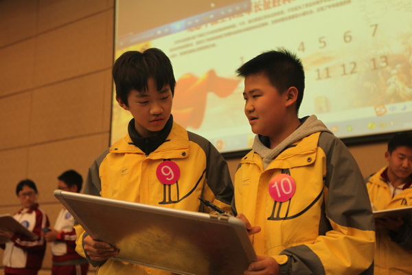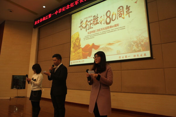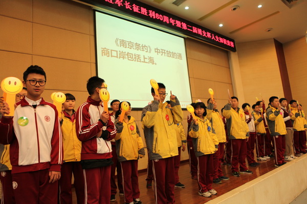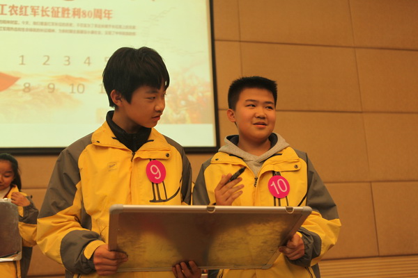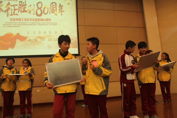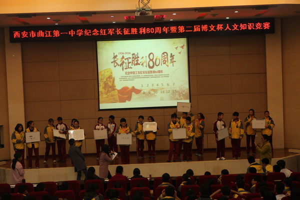 为继续弘扬中国工农红军在长征途中表现出的伟大长征精神,铭记历史不忘初心 ,走好新的长征路,激励全国各族人民为实现中华民族伟大复兴的中国梦而努力奋斗。在校领导的大力支持下,我校初2018届学生于2016年11月30日组织开展“纪念红军长征胜利80周年暨第二届‘博文杯’人文知识竞赛”。副校长曹琦老师、政教处主任余爱东老师、总务处主任王锦老师、初二年级组组长张洁老师、历史教研组组长罗红梅老师、政治教研组组长白国强老师、地理教研组组长杨光辉老师作为评委莅临本次比赛现场。