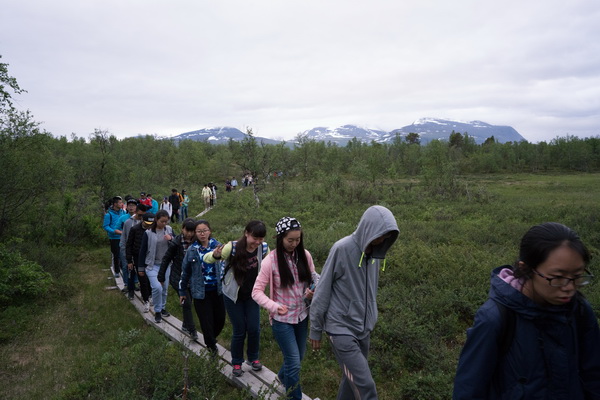 在北极圈的小城阿比斯库,大队人马即在此驻跸一日,然后就要离开,在这里停留的短短一日里竟有24个小时的漫长白昼,我们在小城的上半日用来弥补因昨日乘坐长途火车的疲乏。后于晚上约九时,向著名的国王之路进发。我本以为它应是向着那美丽的无名的山进发,那山隐没在云层深处,只留一个美好的剪影。可没想到道路分岔之时,我们向着另一边走去了与那美丽的山别离,一头扎入了林莽之中,也不知路长几何,何时可以归还。