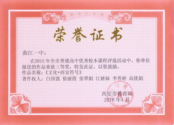 在2015年西安市普通高中优秀校本课程评选活动中历史教研组报送的作品《长安——中国的DNA》荣获二等奖,政治教研组报送的作品《文化·西安符号》荣获三等奖