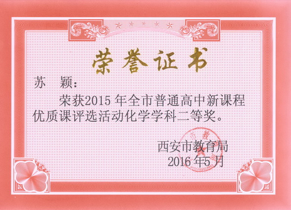 在2015年西安市普通高中新课程优质课评选活动中苏颖老师获化学学科二等奖。