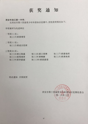 此次活动采取书面答题形式,西安地区共有1000多所学校的近18万青少年参加,截至规定时间共收取178000多份有效答卷。经过专家组的评选,最终评判出特等奖30名、一等奖295名、二等奖680名、三等奖4300名;先进单位230个。我校500余名学生参加了此次活动,共1名学生获得一等奖、1名获得二等奖、8名获得三等奖,学校获“先进单位”称号。