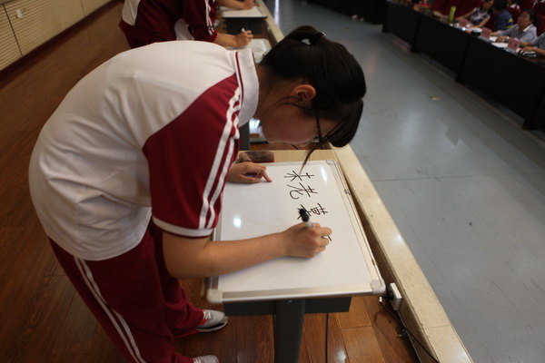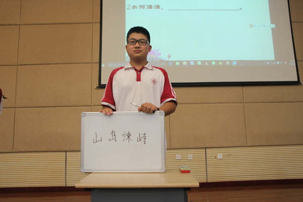 比赛的第一关“珠联璧合”分为五轮进行,每轮比赛随机抽取学号选出各班选手参赛,进行诗句默写比赛,答对者即可为班级加分。随着比赛的进行,台下的气氛也逐渐紧张了起来,观众们一边看着屏幕上不断闪现的题目,另一边也默默的为台上的选手捏了一把汗。五轮角逐,台上的选手沉着冷静,深思熟虑;台下观众的呼声是一浪高过一浪。第一关六个班群雄逐鹿,难分胜负。