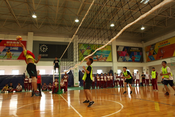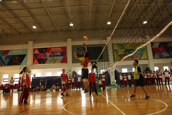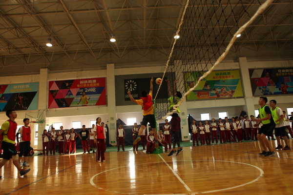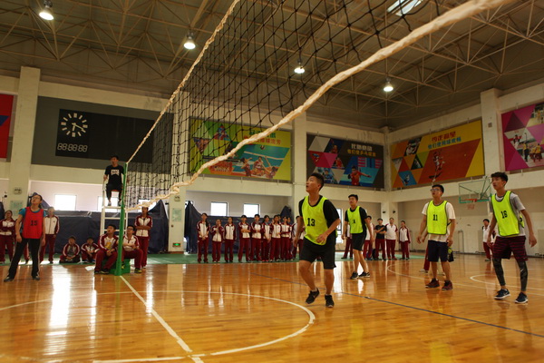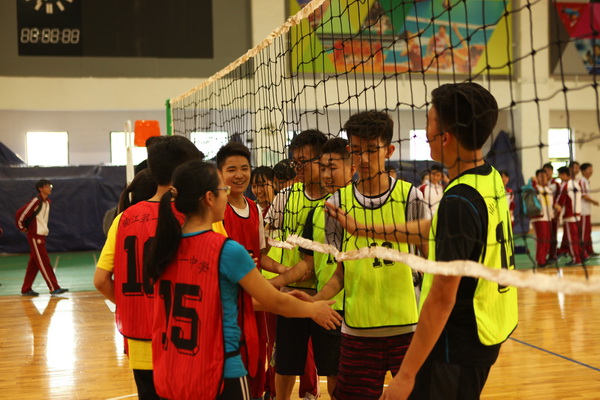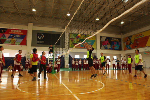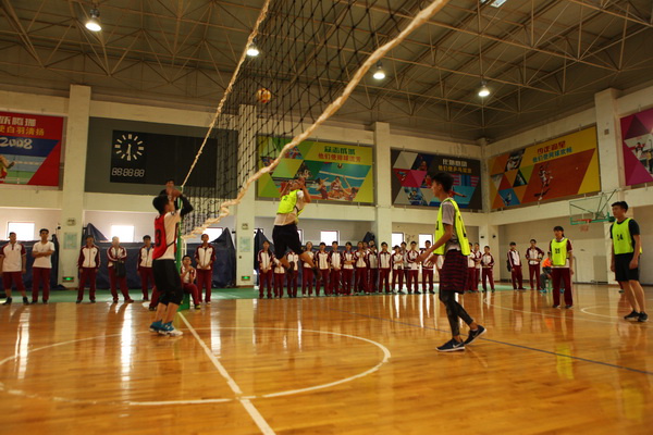 还未开赛,赛场上就已人头攒动,同学和老师们聚集在赛场周围翘首以待这一场精彩赛事的开始,随着一声哨响,各班的队员们便开始了龙争虎斗。一个个精彩的拦网、扣球,团队间一个又一个完美的配合都让观战的同学们欢呼不已。落后的队伍也毫不逊色,不断地调整自己的战略战术,为了搬回比分显示出了他们永不放弃的精神。此时,场下的拉拉队也喊破了嗓子为自己的班级加油助威,好一派热闹的场景。