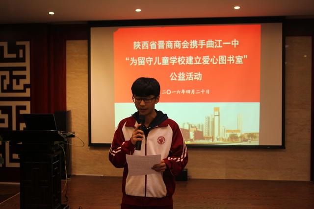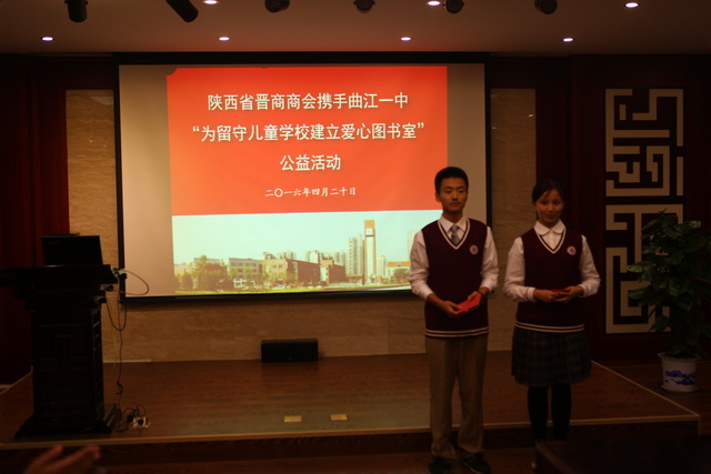2016年4月20日下午,陕西省晋商商会携手曲江一中举办的“为留守儿童学校建立爱心图书室”公益活动捐赠仪式在国学教室举行。此次活动由陕西省晋商商会发起,曲江一中团委学生会组织。参加捐书仪式的企业家有:陕西省晋商商会公益部部长陕西鑫能环境科技股份有限公司董事长吕艳红 、陕西省晋商商会副会长陕西三晋捷安物流有限公司总经理卫高文 、陕西省晋商商会会员,西安立德电梯配件有限公司总经理畅彪 、陕西省晋商商会会员西安鑫亚图商贸有限公司总经理吉晓惠 。我校副校长曹琦、校办兼政教主任余爱东参加了仪式。学生会主席李欣沛、副主席花珂凡和初二9班、高一5班学生作为学生代表参加了捐书仪式。