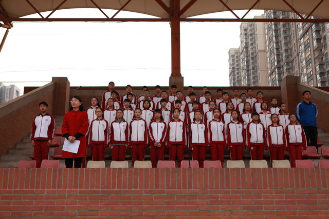 九点五十分,升旗仪式正式开始。伴随着激昂的《义勇军进行曲》,鲜艳的五星红旗徐徐升起,在曲江一中的上空迎风飘扬。