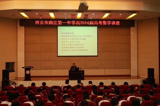 3月17日,西安市曲江第一中学特邀请陕西师范大学附属中学特级教师、国家骨干教师、教研室主任何喜安老师在报告厅做《2016年高考数学复习建议》的讲座。2016届高三全体学生及教师参加,会议由西安市曲江一中教务处副主任高秋棉老师主持。现场气氛热烈。