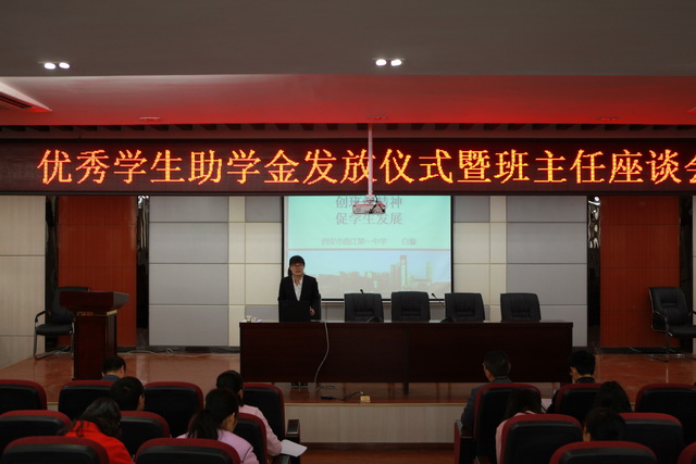 示范课后,在漩涡初级中学多功能厅举办了2016年优秀学生助学金发放仪式暨班主任工作座谈会,曲江一中学校办公室兼政教处主任余爱东、汉阴县体教局教研室主任程树安、汉阴县漩涡初级中学校长鲁维明、副校长付刚、副校长黄磊、汉阳中学部分教师及优秀学生代表参加了本次会议。会上,鲁校长发表了热情洋溢的讲话,他首先对曲江一中连续六年的中考交流和优秀学生助学圆梦活动给予了充分肯定和衷心感谢,两校的中考交流活动开辟了全面共建和资源共享的新途径,给两校师生发展带来新的契机和福音。
