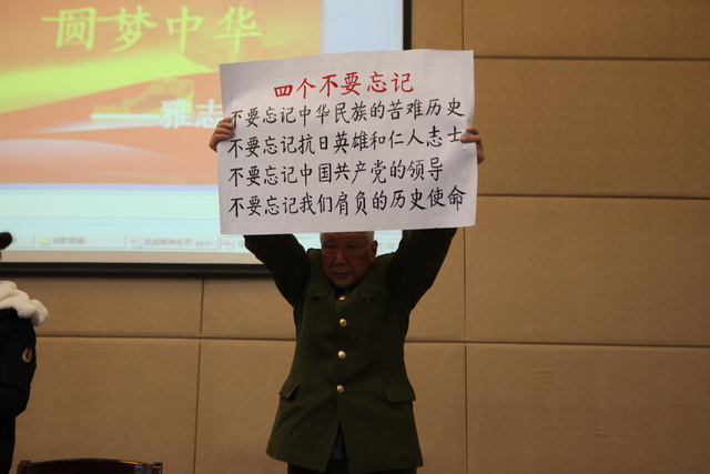 从参加抗美援朝和保家卫国战争的老兵,到兢兢业业的人民教师,杨清源老教授对于如何“避免悲剧重演、实现中华民族伟大复兴”也有着自己的看法。他认为,这一重大任务离不开在校大学生的奋斗。“硝烟弥漫70年,抗战精神永留存”,杨清源语重心长地说:“同学们,中国梦由解放军、科学家和教师们托起,更是由你们托起的。大家正处于生机勃勃的青春,更应该将‘中国梦’与‘我的梦’紧密相连,以艰苦奋斗、百折不屈的抗战精神去实现中华民族的伟大复兴!”
