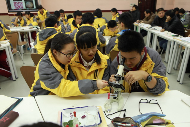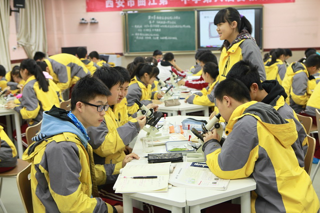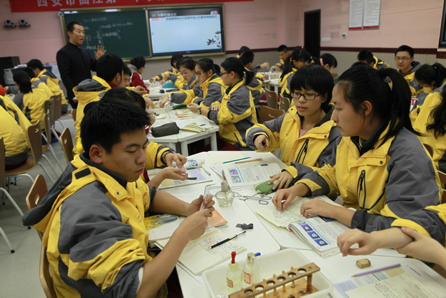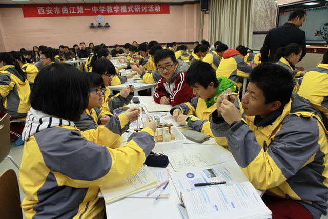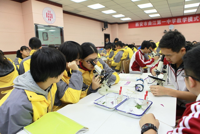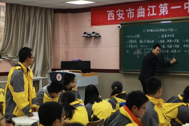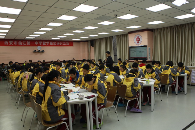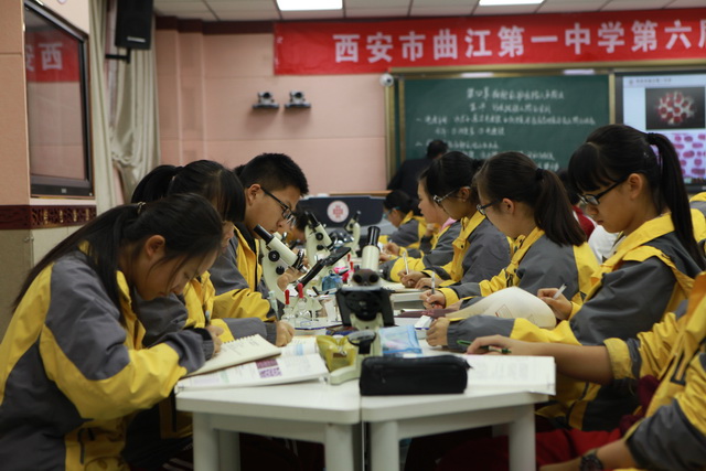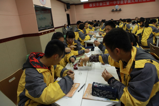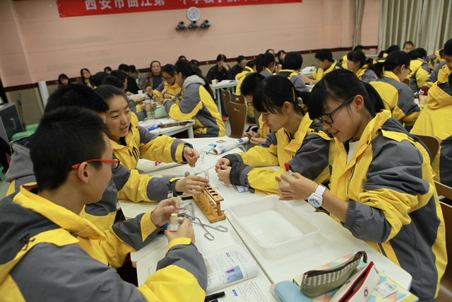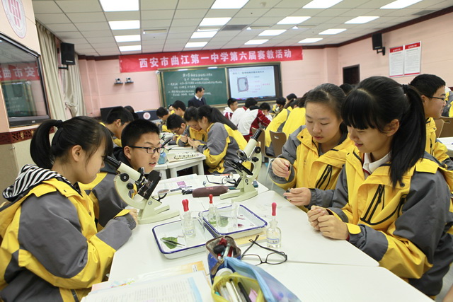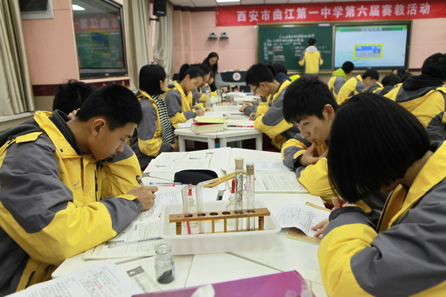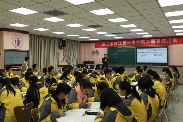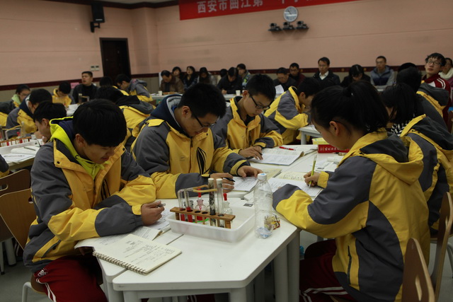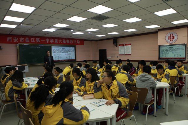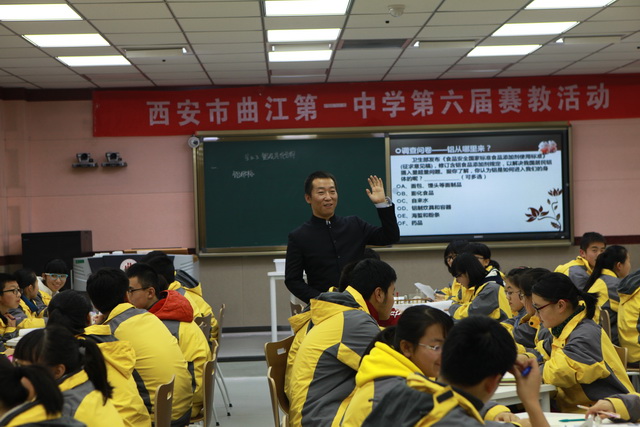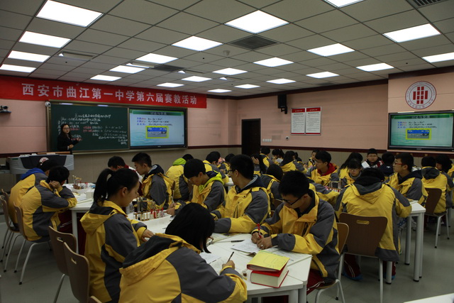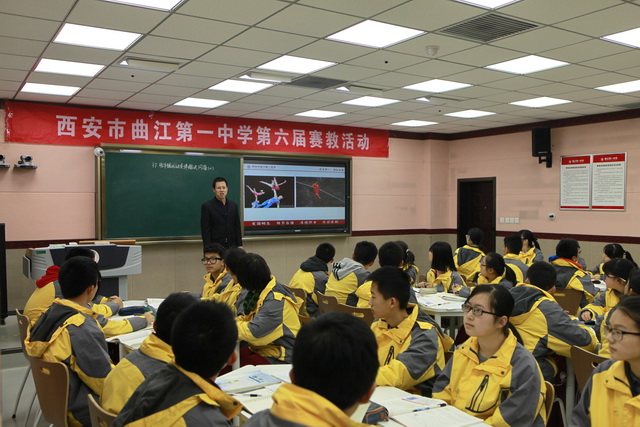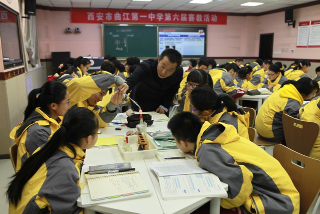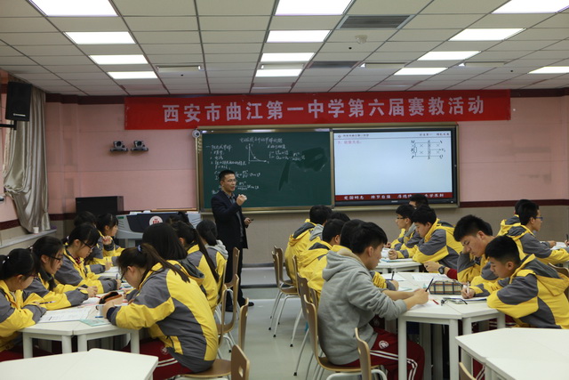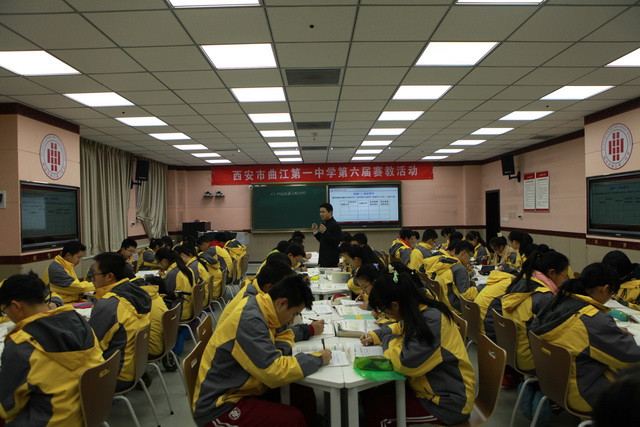 2015年12月9日,曲江一中第六届赛教活动(高中组)进入到了第四天。今天上场的是理综组的六位老师。比赛特邀陕西师范大学生物学课程与教学论李高峰教授,雁塔区教师进修学校物理学科赵万教研员、化学学科马鑫教研员和生物学科韩红艳研究员,陕西师范大学附属中学原化学教研组长刘孝元老师,以及西安市曲江第一中学理综教研组组长赵常斌老师担任评委。来自后柳中学、西安市第四十五中的部分老师,及我校的全体理科教师观摩了这次比赛。